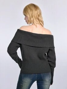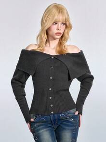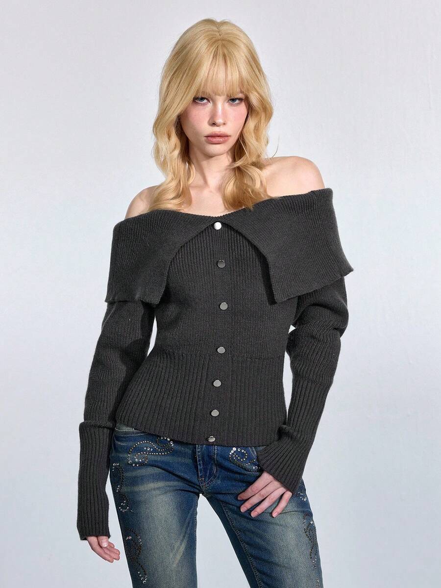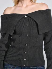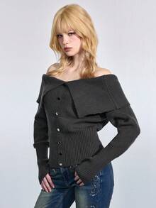 J-Fashion Women's Solid Color Off Shoulder Long Sleeve Button Design Fashion Sweater, Autumn/Winter