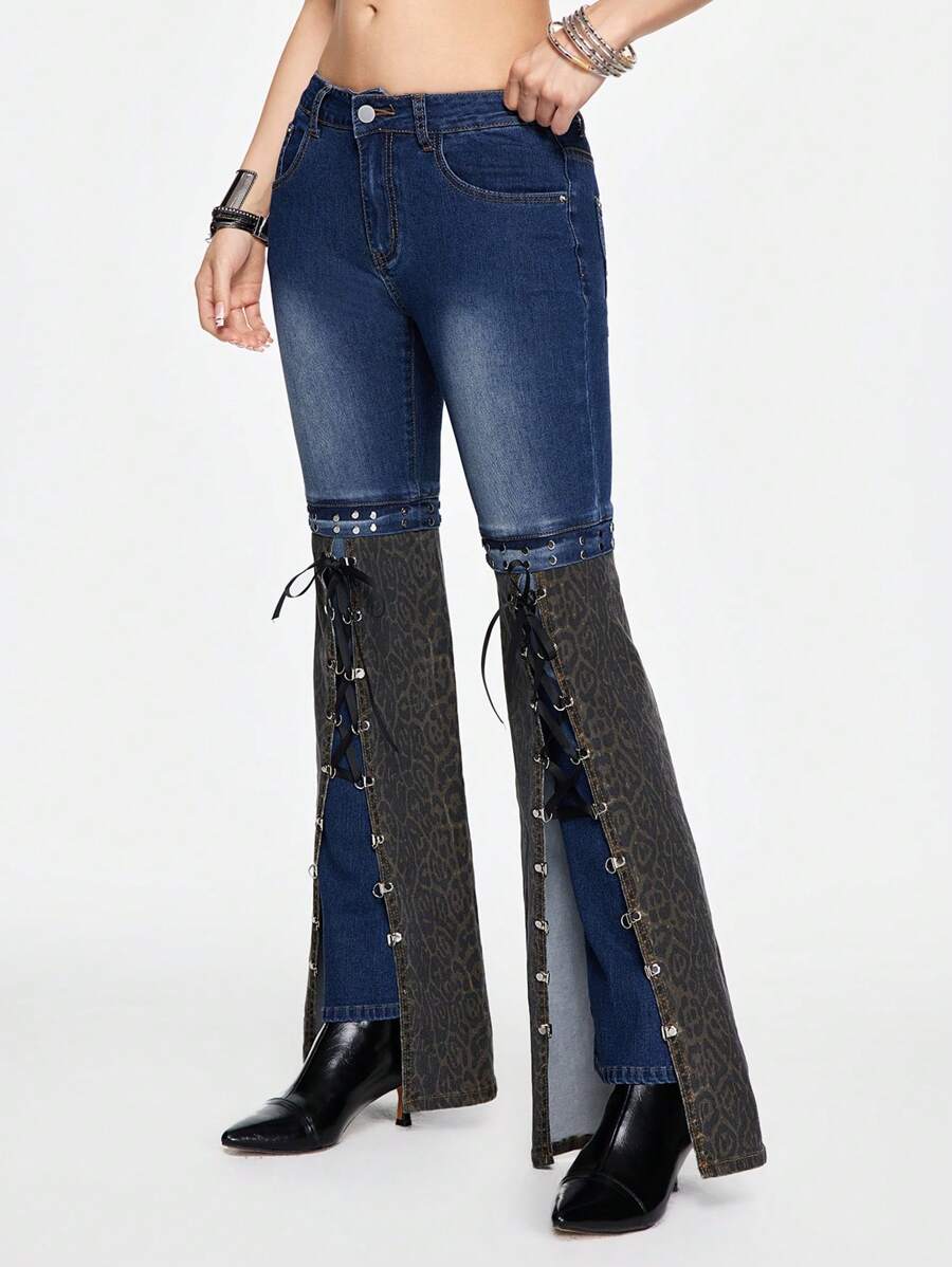 J-Fashion Women's Y2K Vintage Leopard Print Splice Ribbon Tie Flare Leg Pants