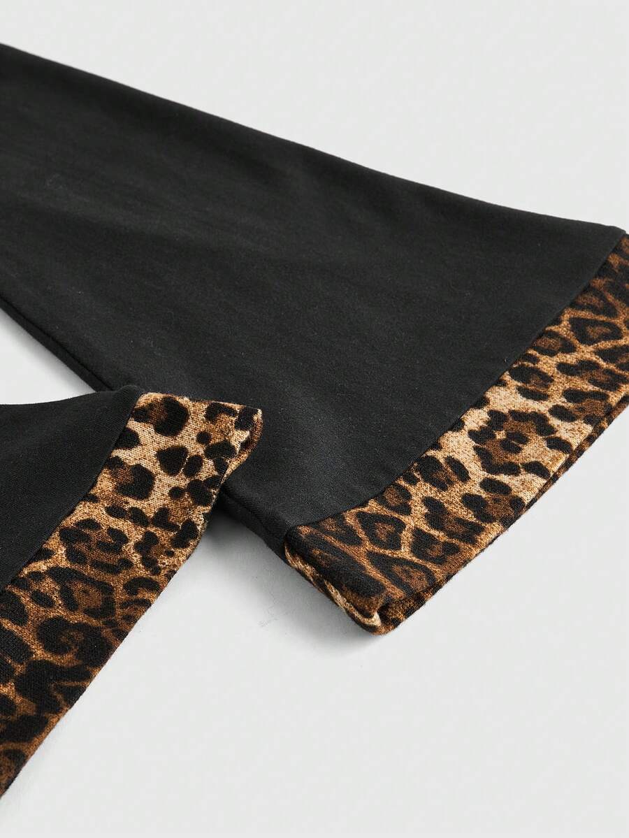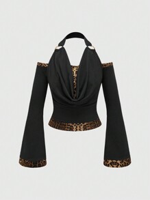 J-Fashion Y2K Gyaru Survillage Deep Draped Neck Bell Sleeve Leopard Print Mock 2 Pieces T-Shirt For Women