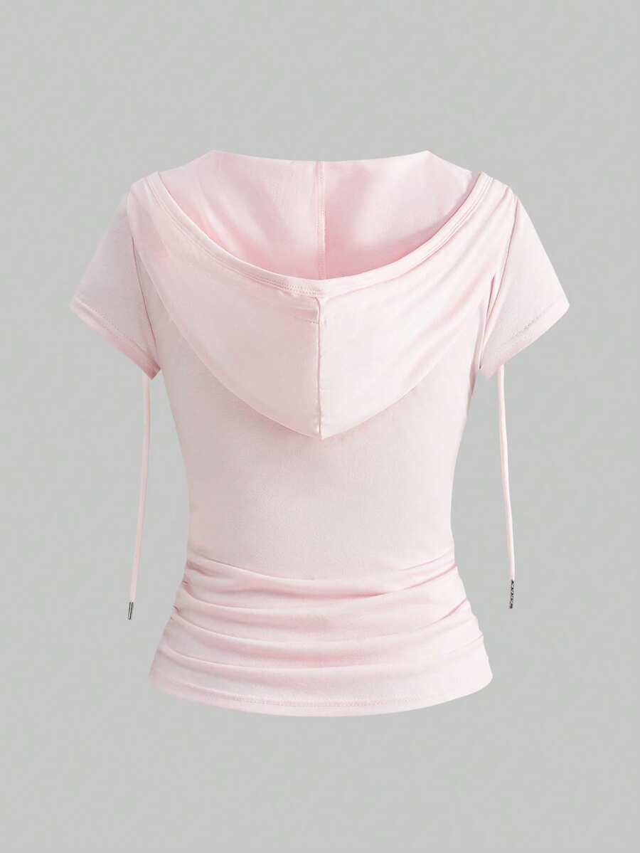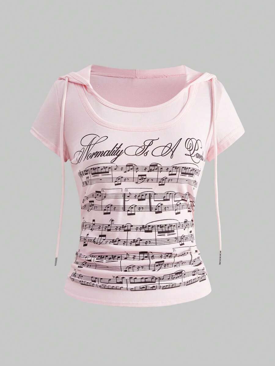 J-Fashion Y2K Retro Millennium Babe Music Note Print Hooded 2 In 1 Short Sleeve Hoodie