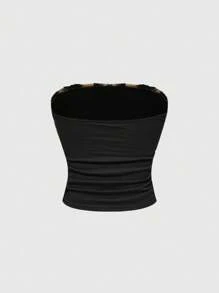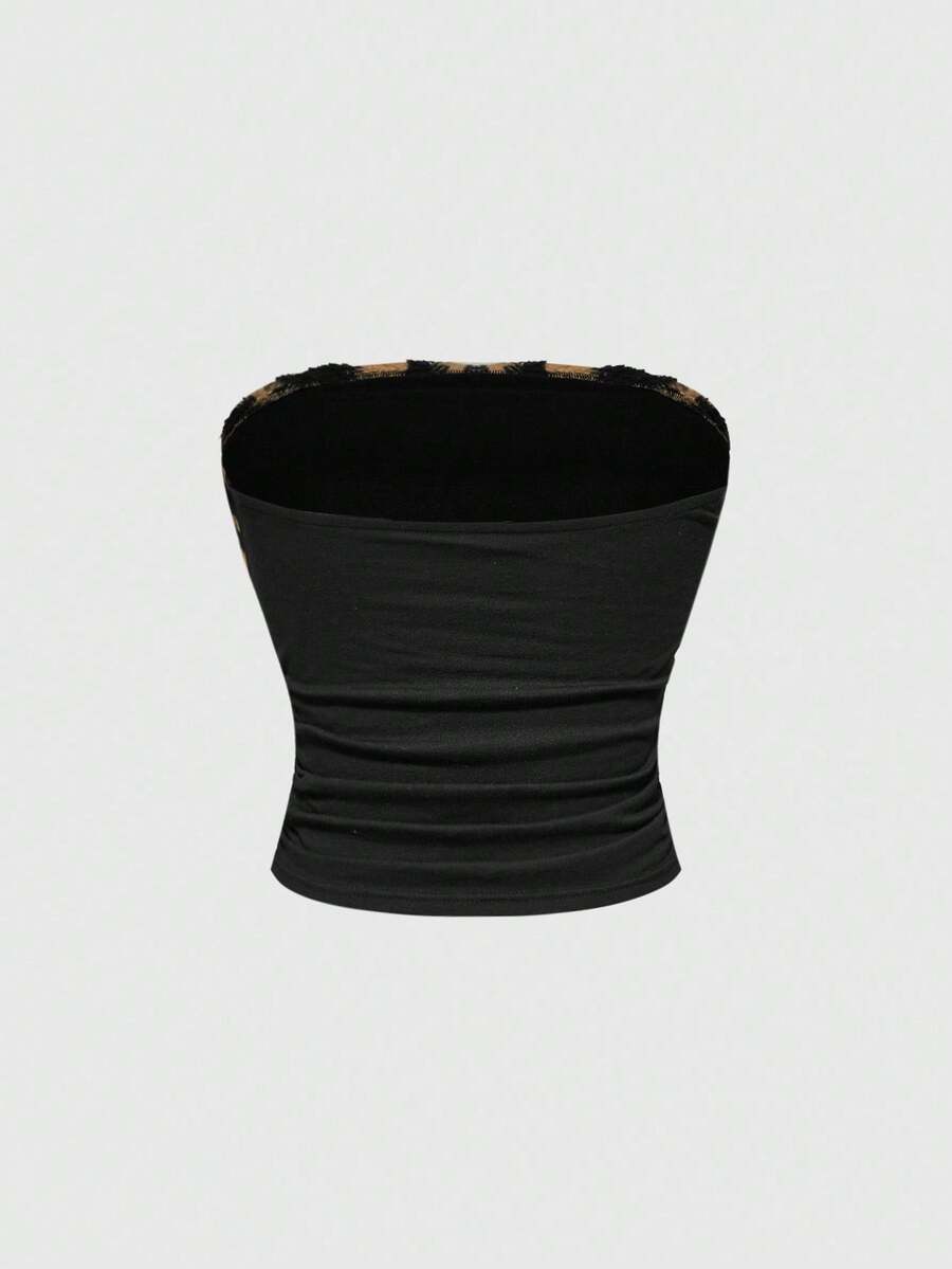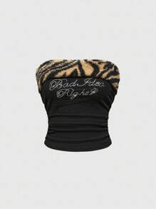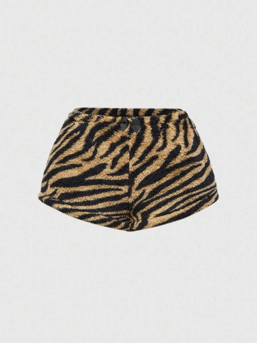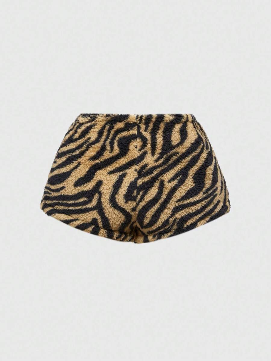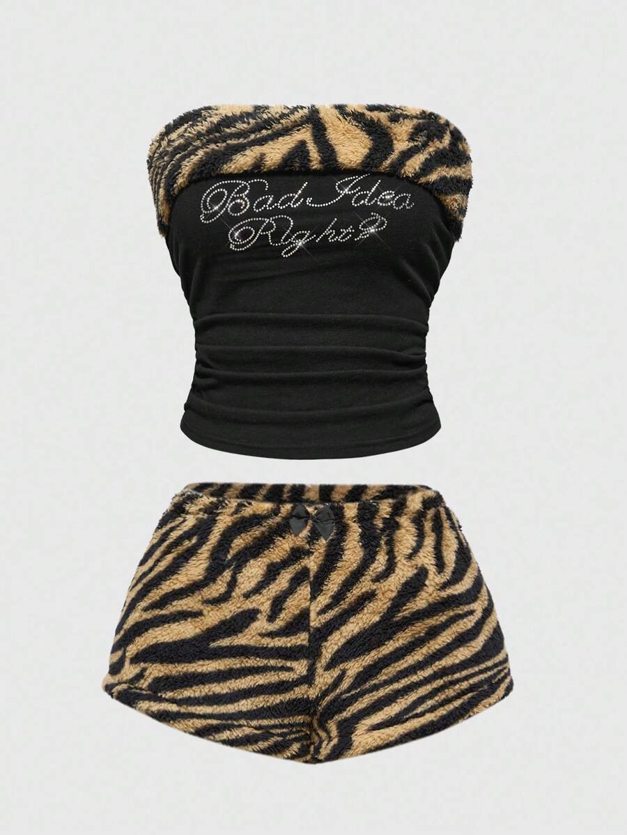 J-Fashion Y2K Style Women's 2pcs Set: Zebra Print Rhinestone Decor Tube Top And Fluffy Shorts For Casual Wear