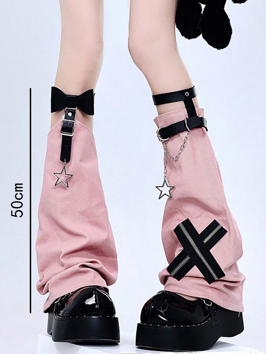 Kawaii 1 Pair Back To School Cross Chain Leather Buckle Leg Warmer, Neon Pink Goth Punk Style Leg Leg Warmers For Ladies