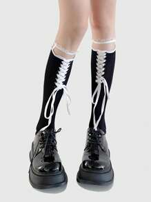 Kawaii 1 Pair Ballet Style Black & White Cross Strap Lace Edge Women Knee High Socks