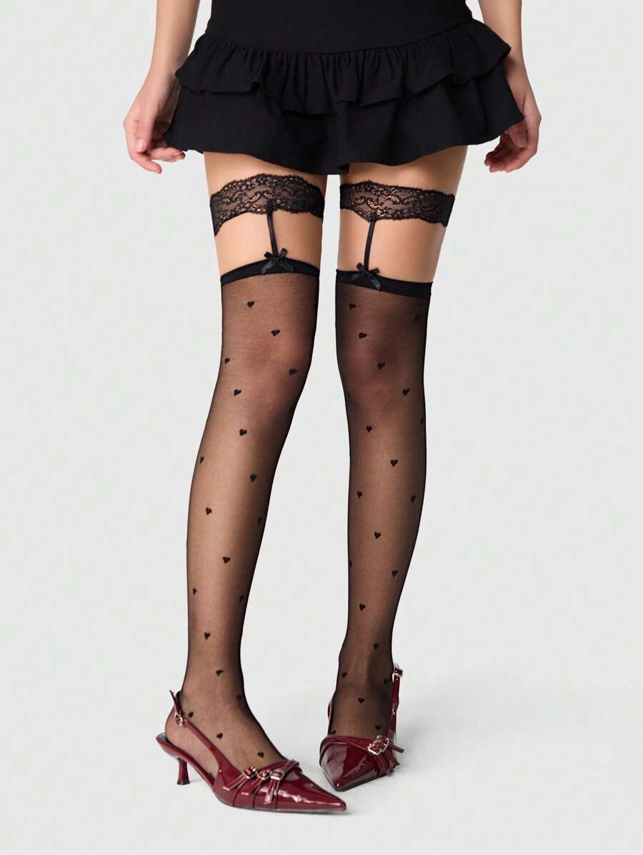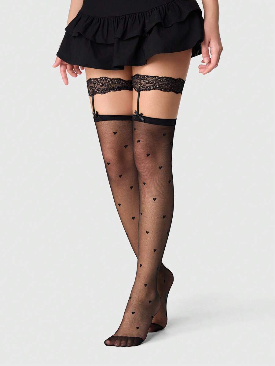 Kawaii 1 Pair Black Lace-Edge Heart Design Over-The-Knee Socks For Women