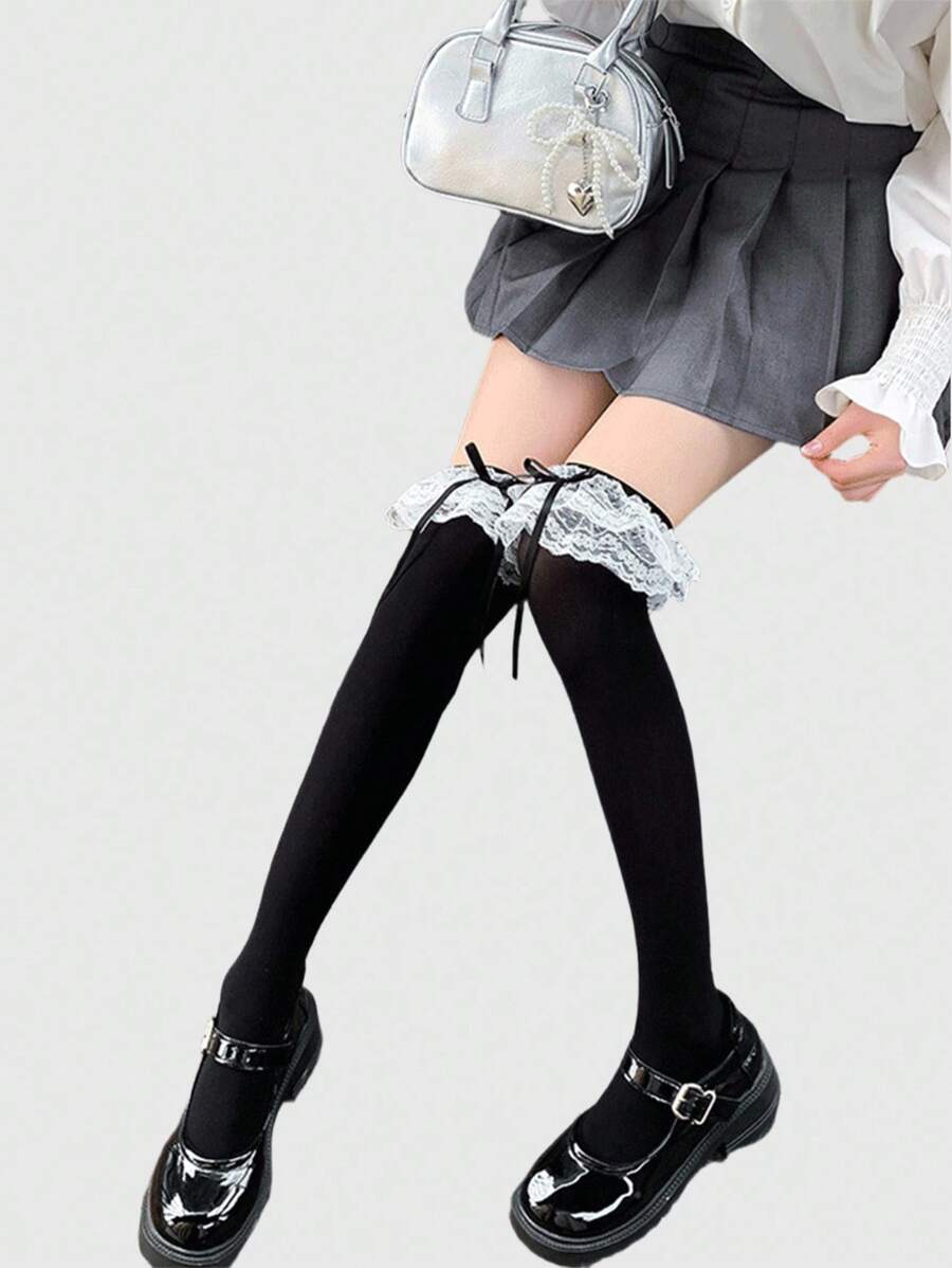 Kawaii 1 Pair Cute Ribbon Bow Over-The-Knee Socks, Lolita Solid Color Lace Trim Thigh High Socks, Daily Wear Ultra-Thin Elastic Sheer Tights