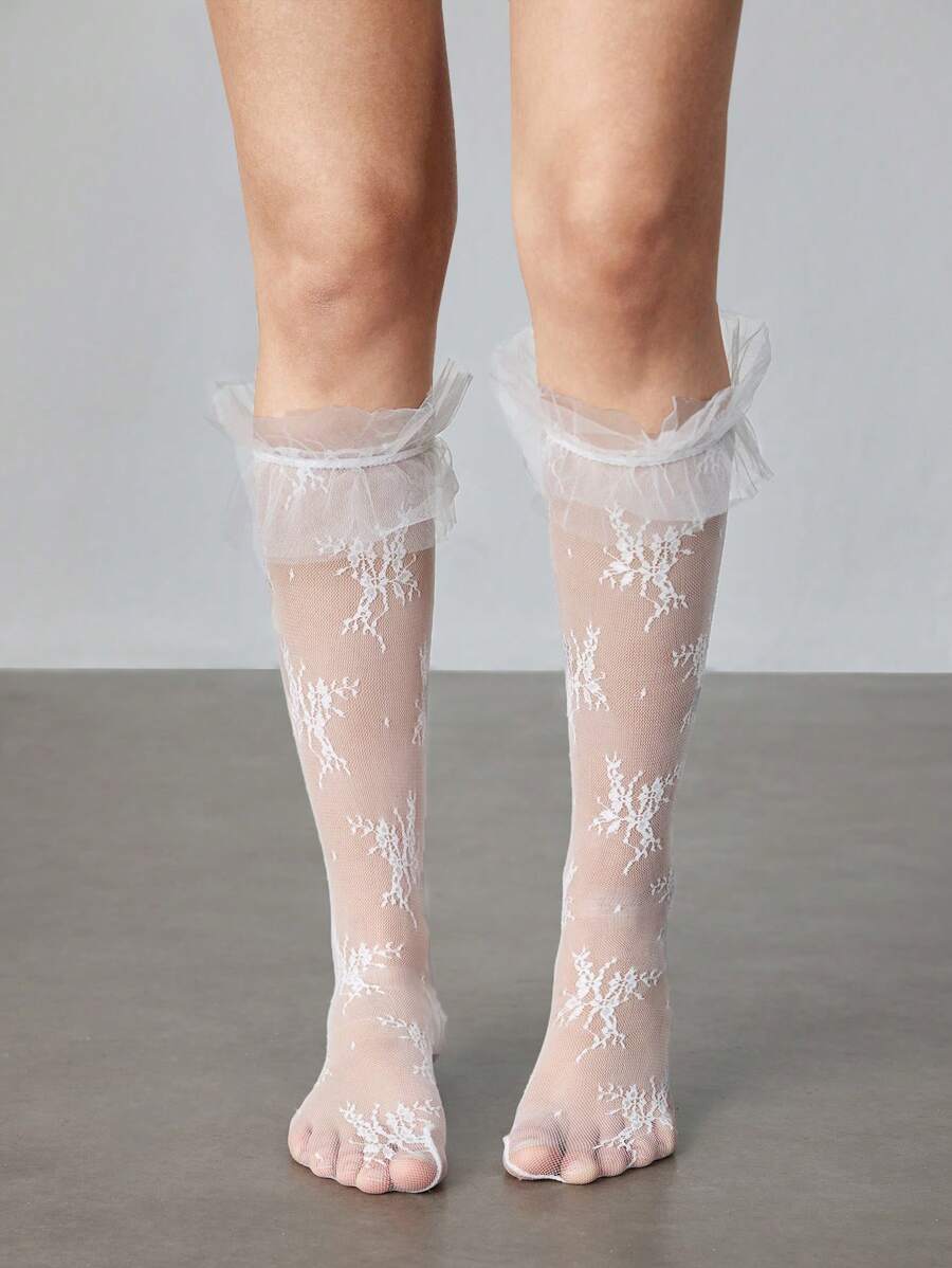 Kawaii 1 Pair Cute White Mesh Floral Lace Mid-Calf Socks, Sheer Floral Vine Pattern Socks, Versatile College Style For Women