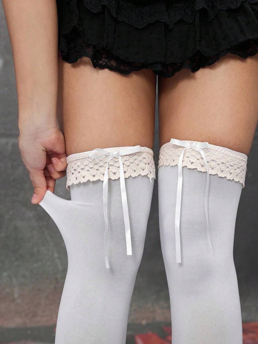 Kawaii 1 Pair Dark Lace Trim Pearl Bow Over-The-Knee Socks