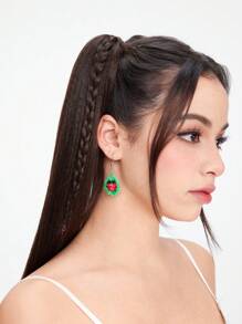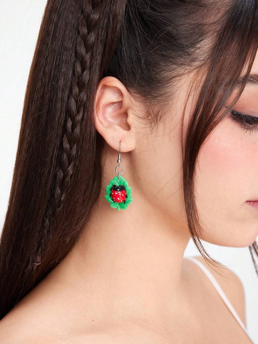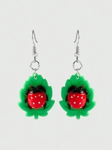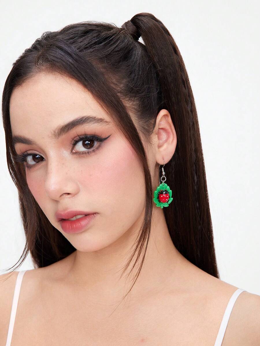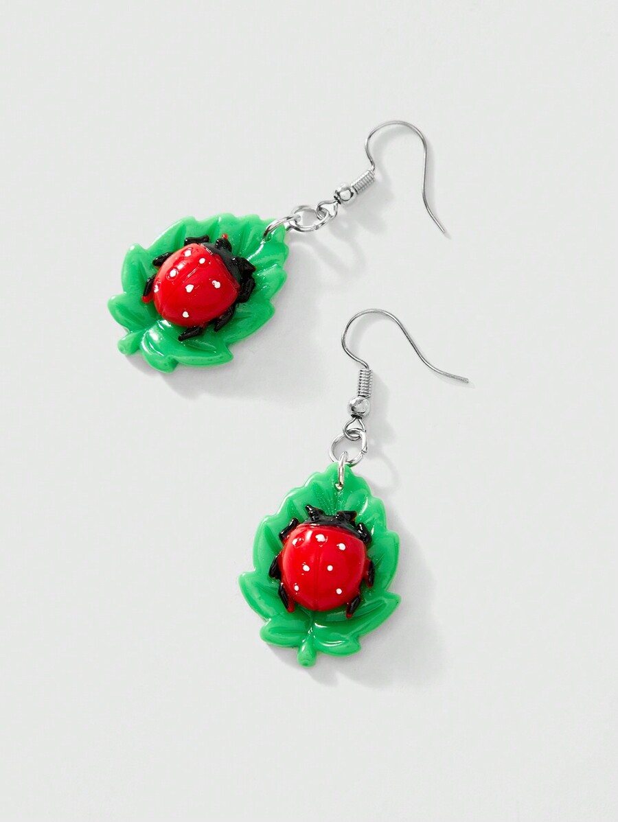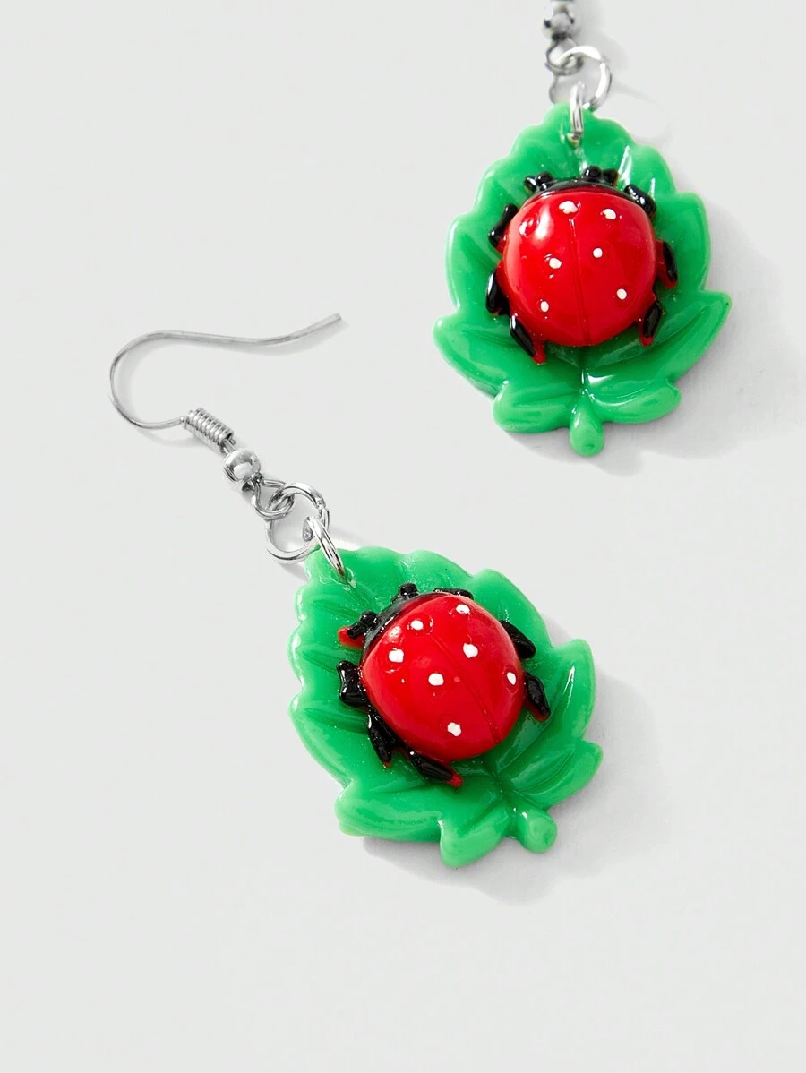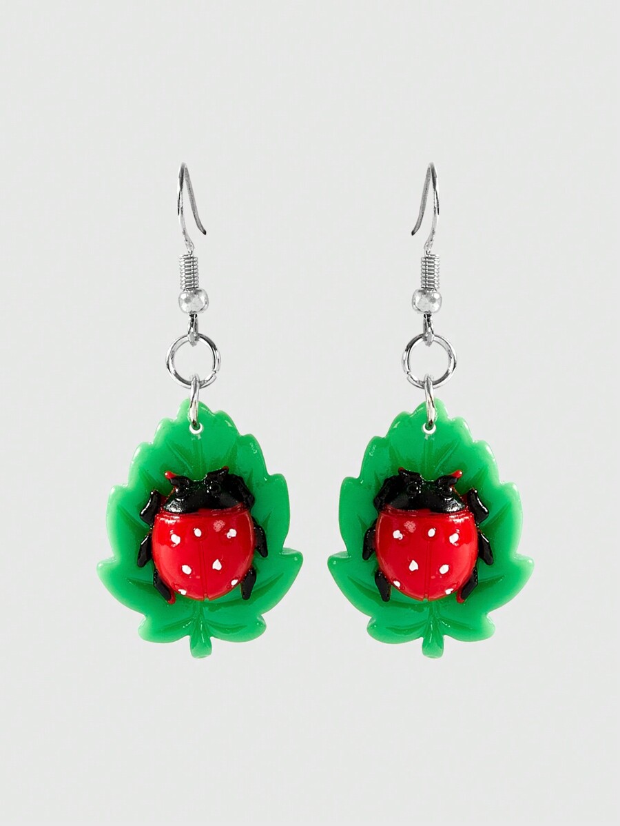 1 Pair Kawaii Playful 3D Green Leaf & Ladybug Insect Earrings