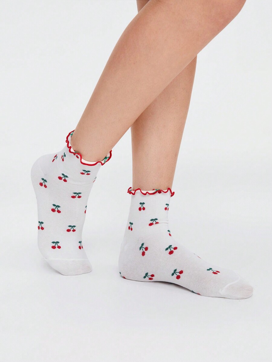 Kawaii 1 Pair Of Women Mid-Calf Socks With Cherry Pattern And Ruffled Edges, Suitable For All Seasons.