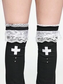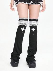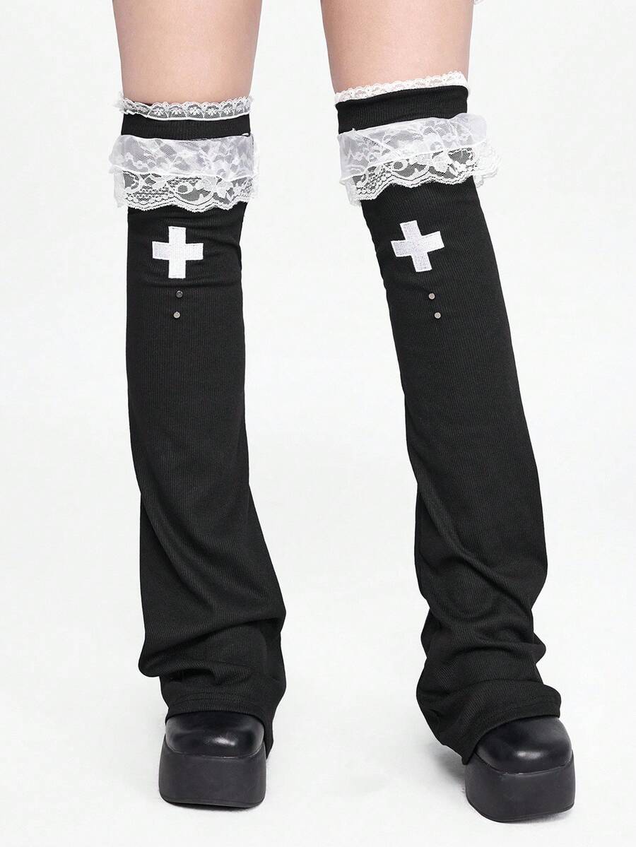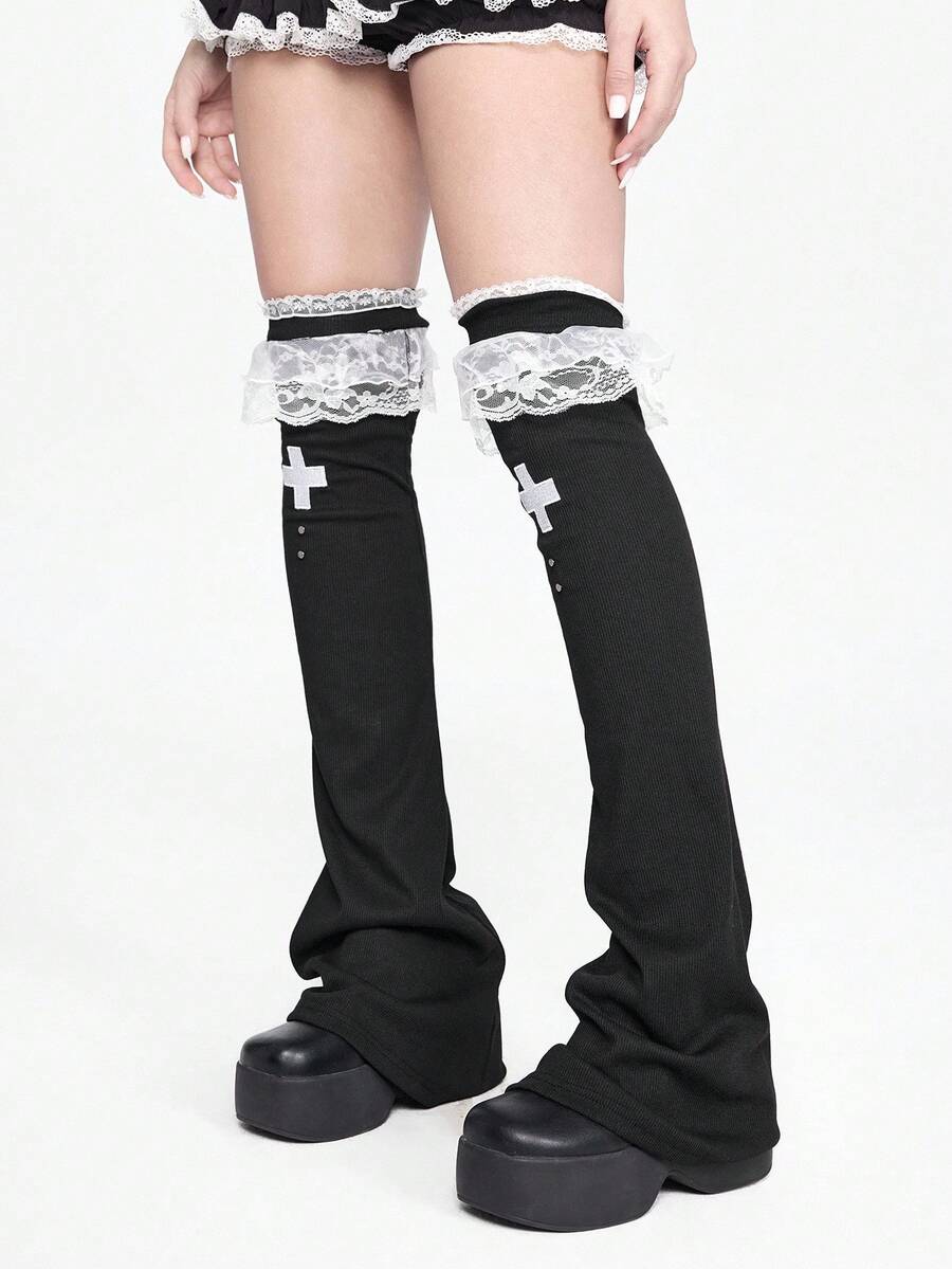 Kawaii 1 Pair Punk Style White Lace Trim Leg Warmers, Y2K Cross Element Black Solid Color Flared Leg Warmers, & Slimming, Suitable For Daily, Festival, Party Outfits