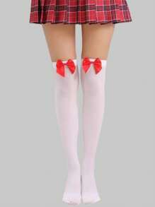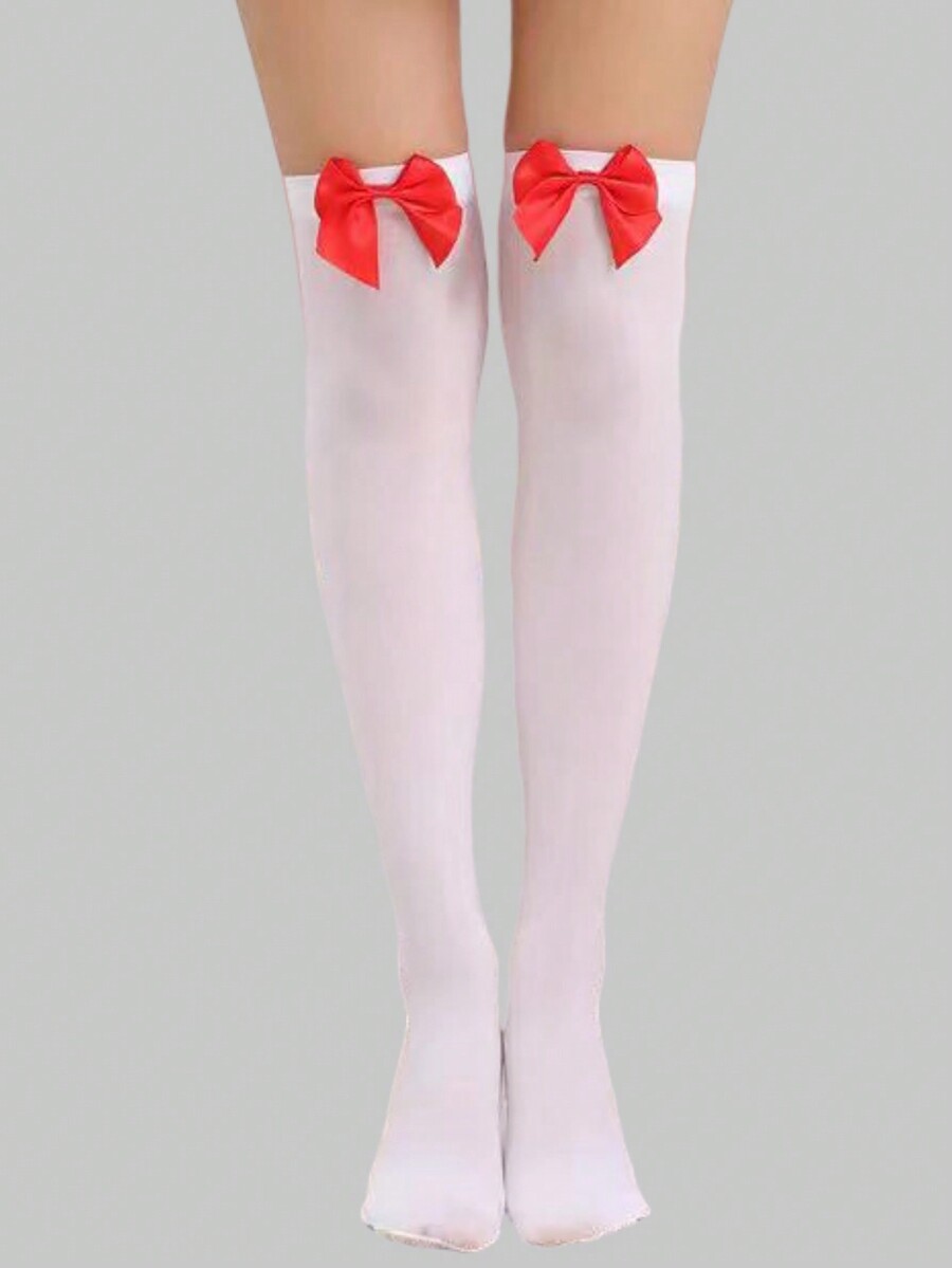 Kawaii 1 Pair White Nylon Over The Knee Socks With Big Red Bow