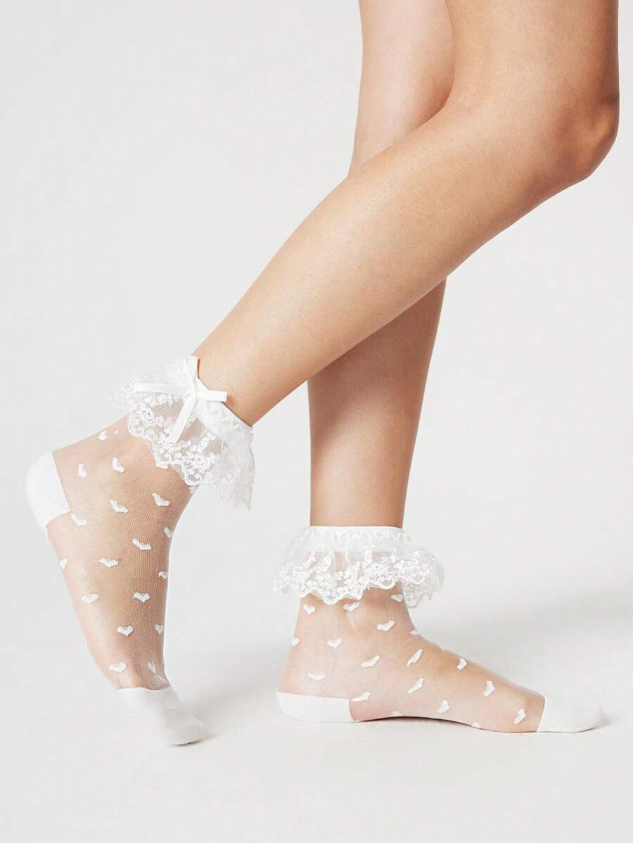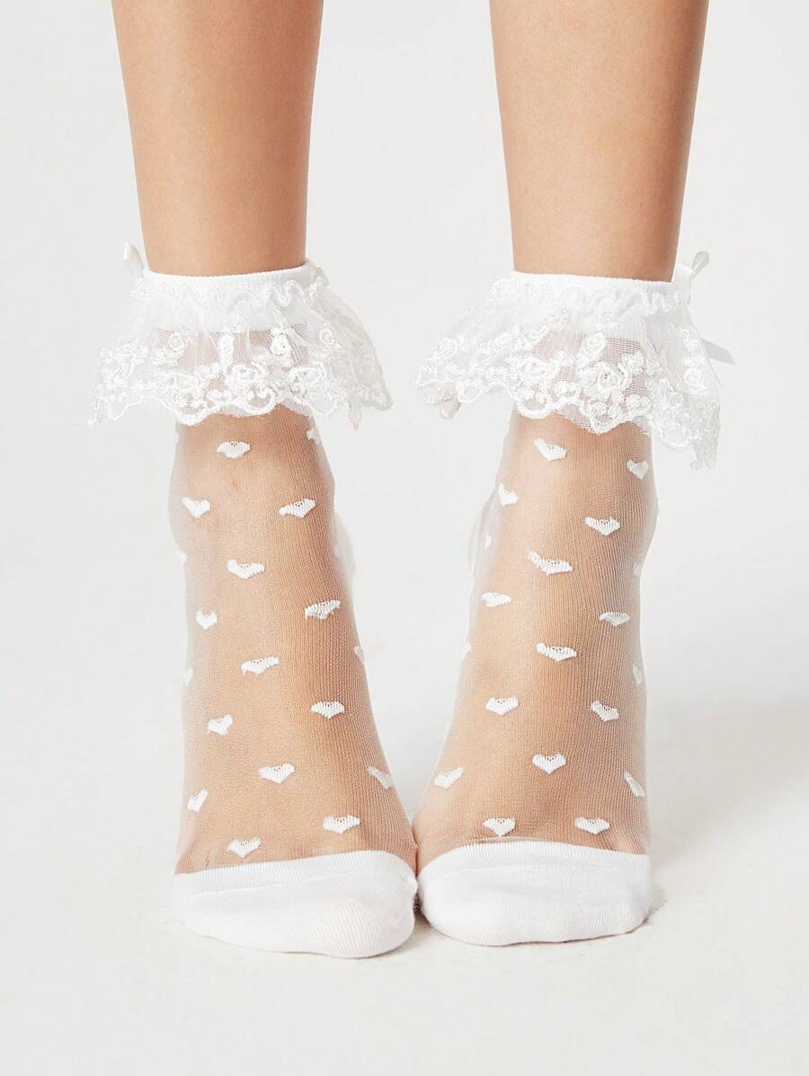 Kawaii 1 Pair Women Lace Socks Lolita Style Heart Pattern Mid-Calf Socks Mesh Tulle White Socks, Summer