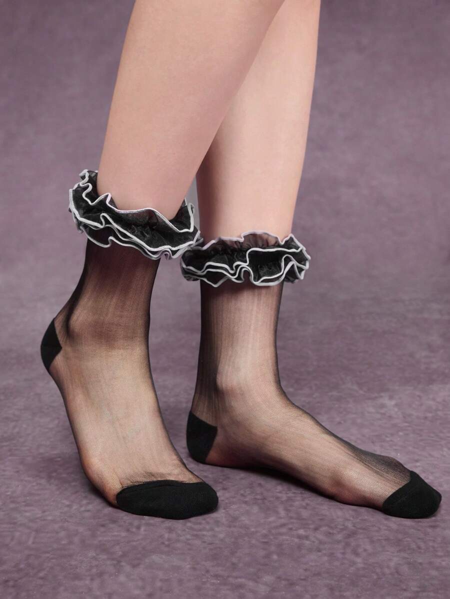 Kawaii 1 Pair Women's All Season Chic Double-Layer Purple Edged Floral Transparent Crystal Ice Silk Mesh Socks
