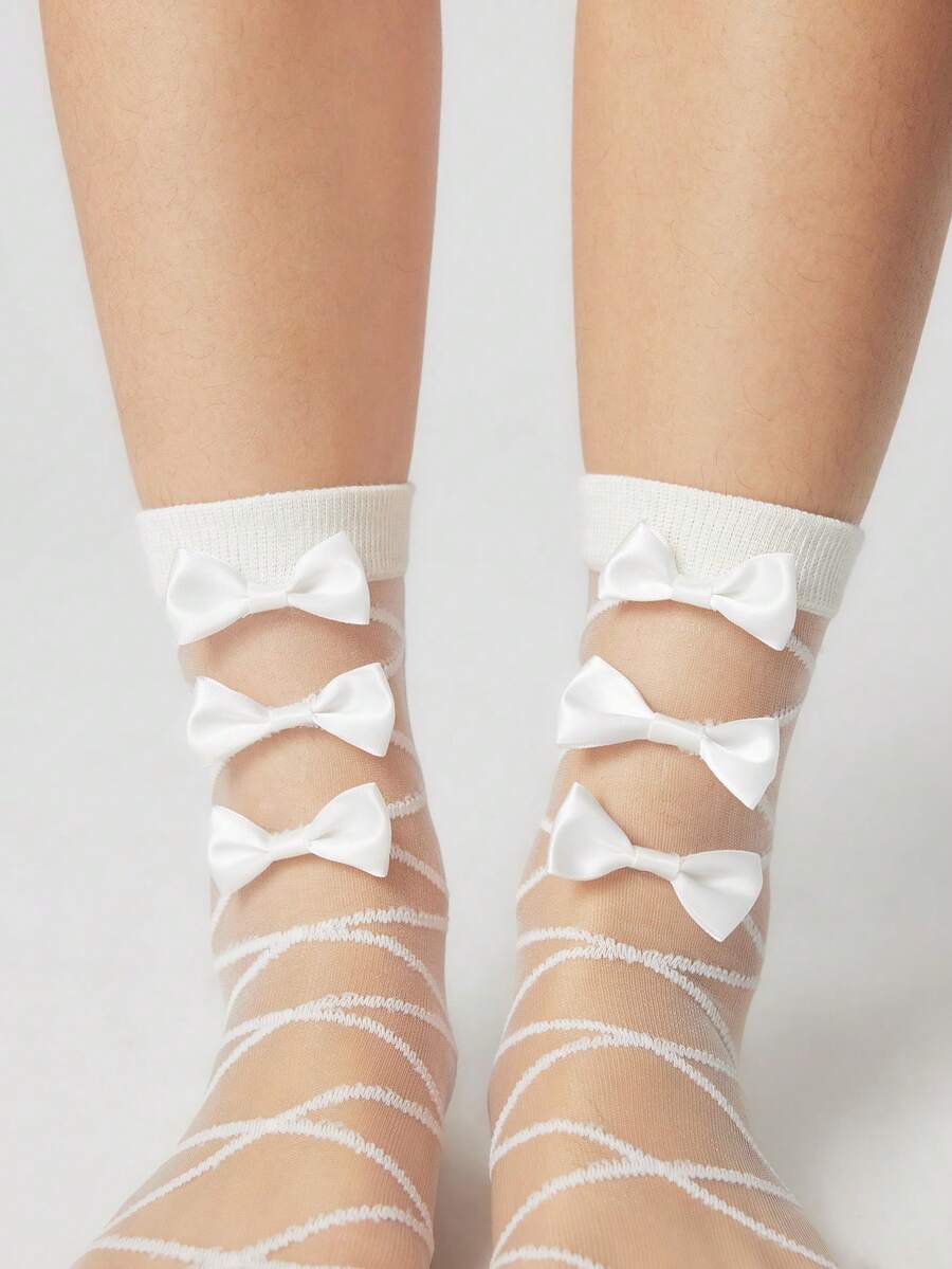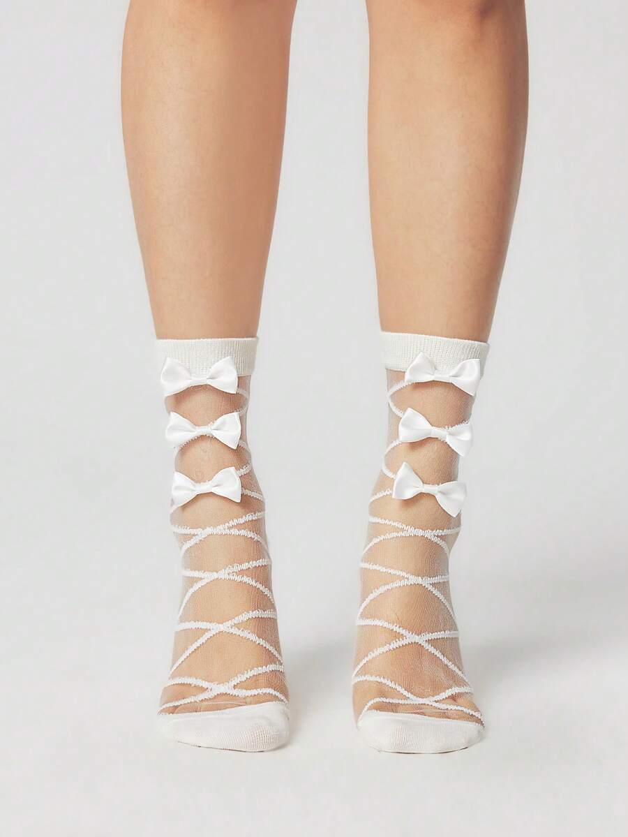 Kawaii 1 Pair Women's Ballet Style White Criss-Cross Bowknot Decoration Silk Mid-Calf Socks, Suitable For All Seasons