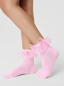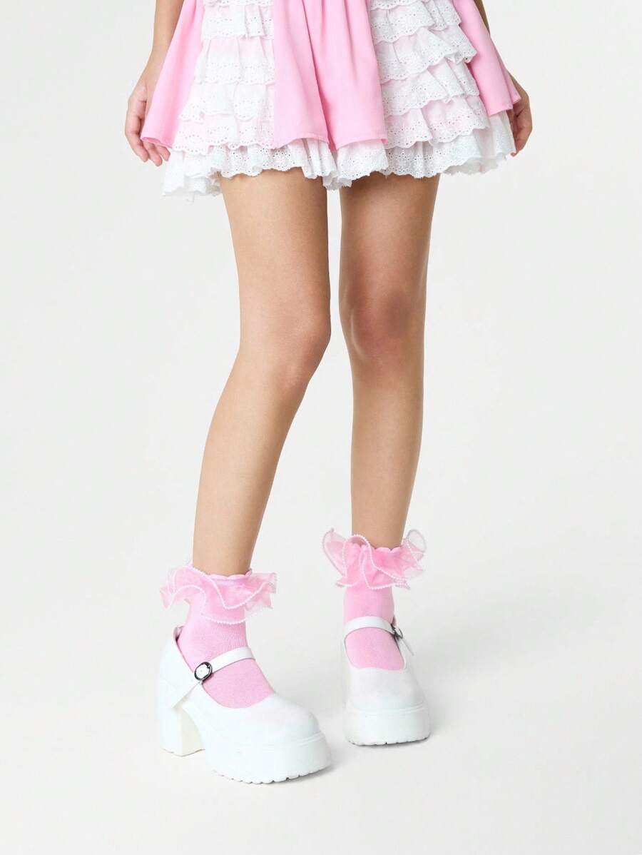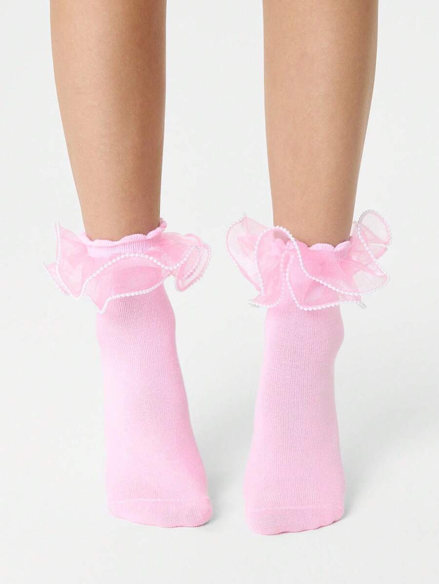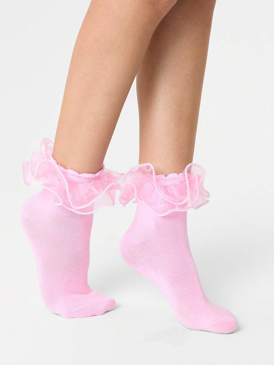 Kawaii 1 Pair Women's Pink Pearl Lace Trim Reversible Mid-Calf Socks, Suitable For All Seasons