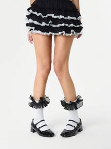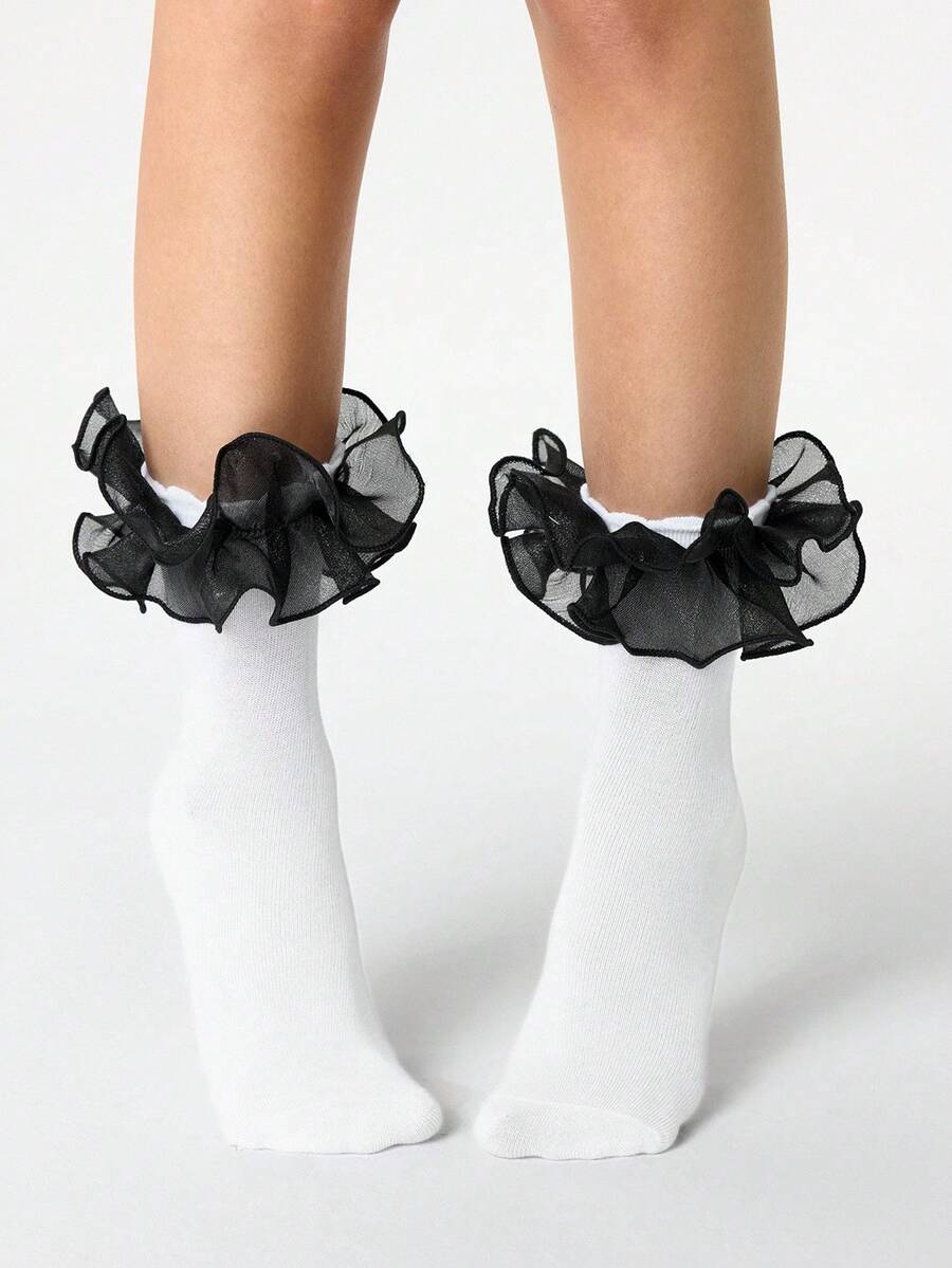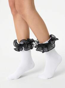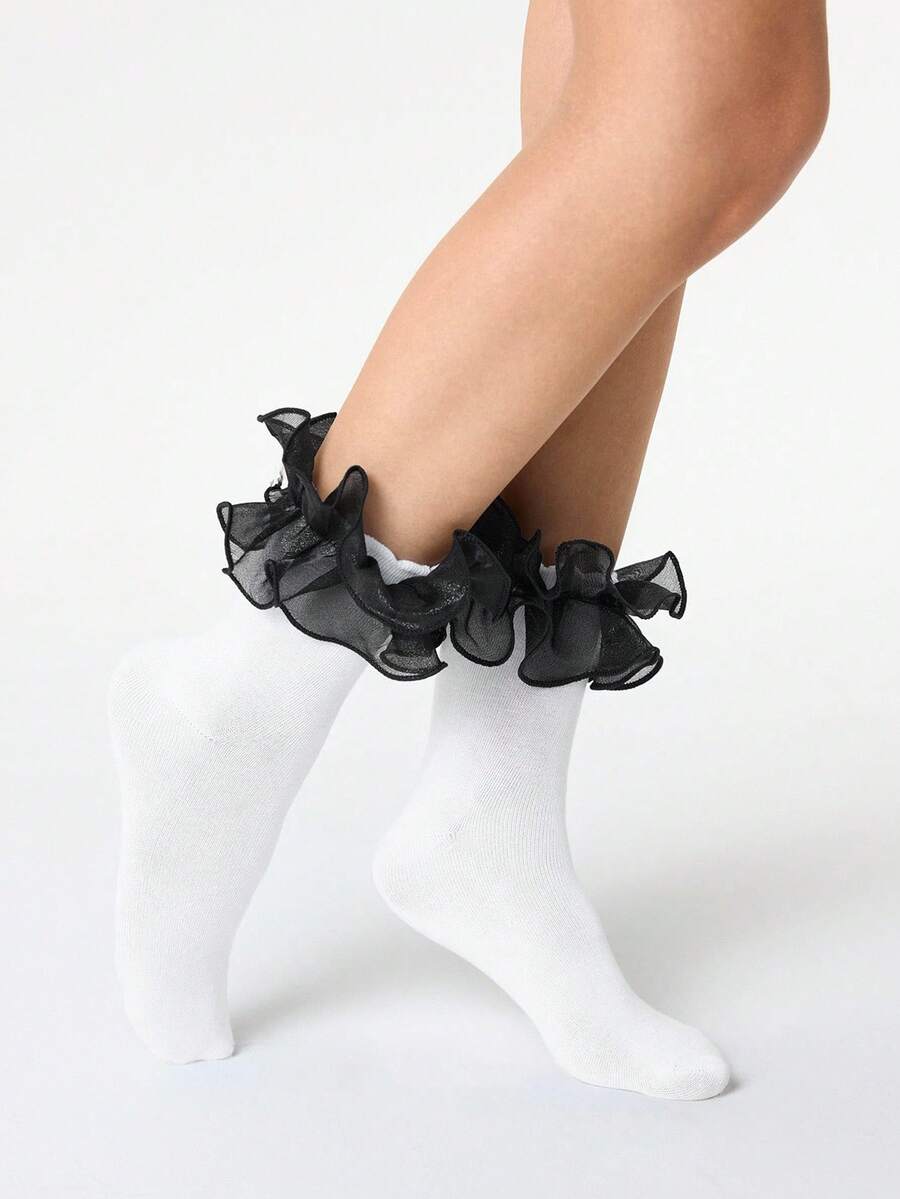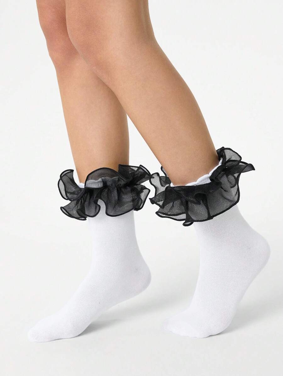 Kawaii 1 Pair Women's Shiny Lace Trim Reversible Mid-Calf Socks, All Season
