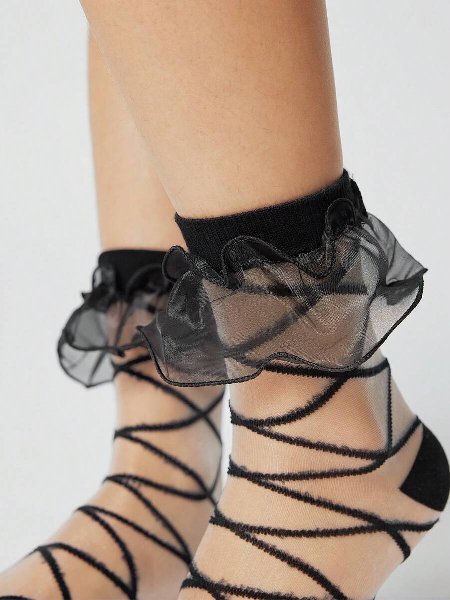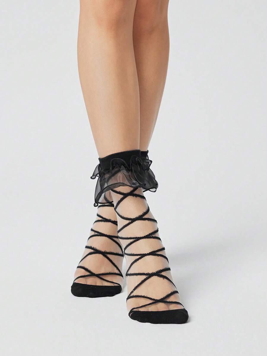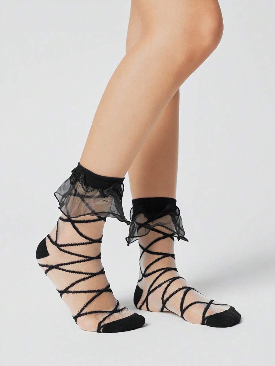 Kawaii 1 Pair Women's Sweet & Edgy Black Double Layer Mesh Trim Criss-Cross Line Crystal Socks, All Season