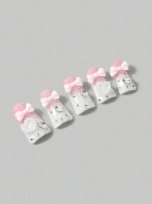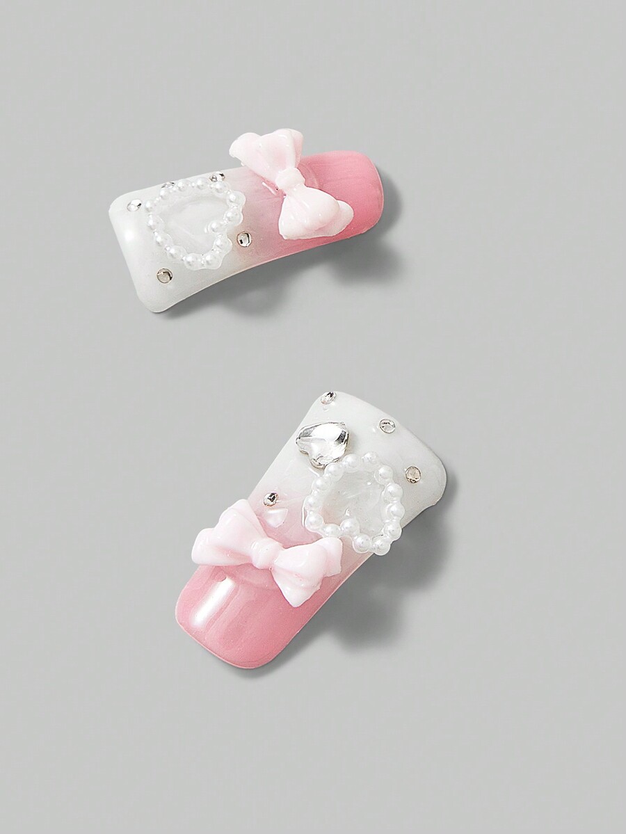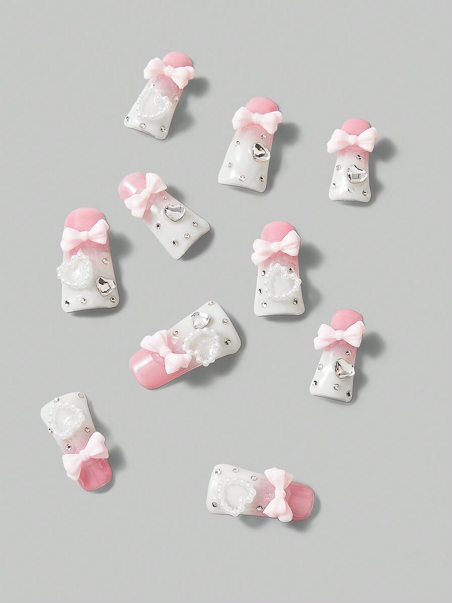 Kawaii 10pcs Cute Style Bow Handmade False Nails + 3pcs Double Sided Adhesive, Detachable Y2K Painted Nail Stickers With High-Quality Heart-Shaped Rhinestones, Suitable For Festivals, Parties, Dances And Daily Wear