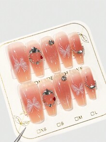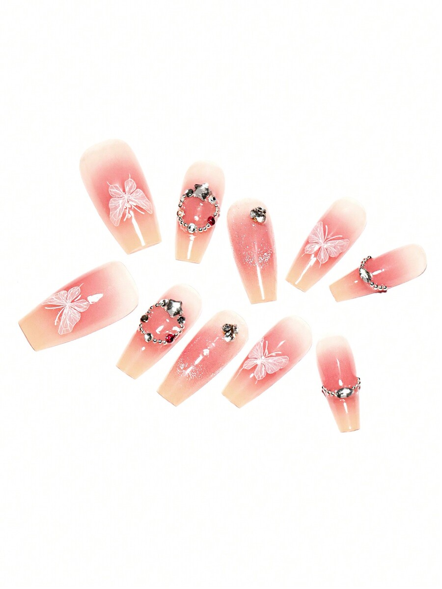 Kawaii 10pcs French Blush Butterfly Cat Eye False Nail Art Decoration Set, Full Coverage