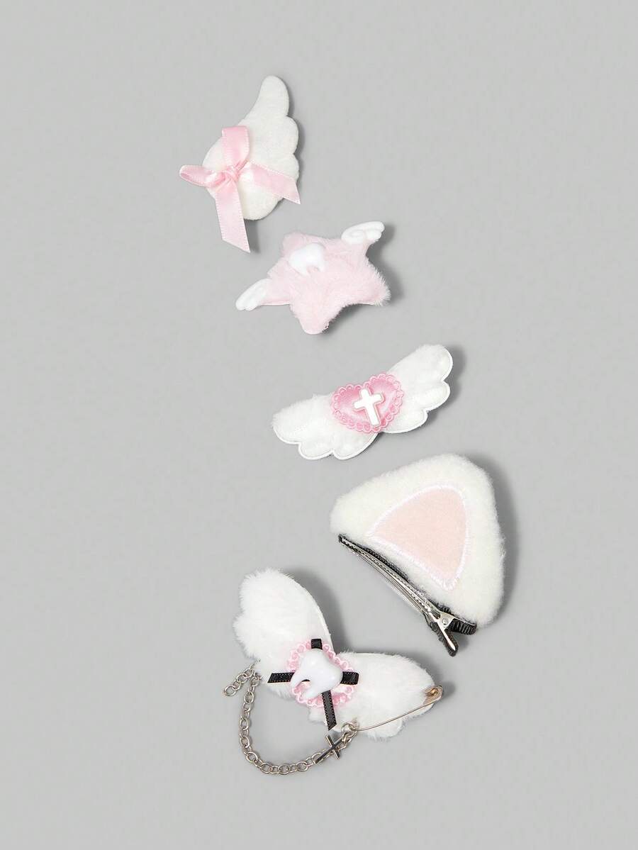 Kawaii 10pcs Random Style Handmade Hair Clips, Pink Lace Wing Star Combination Hair Clips, Cute Cat Ear Bangs Hair Clips, Plush Hair Accessories Set