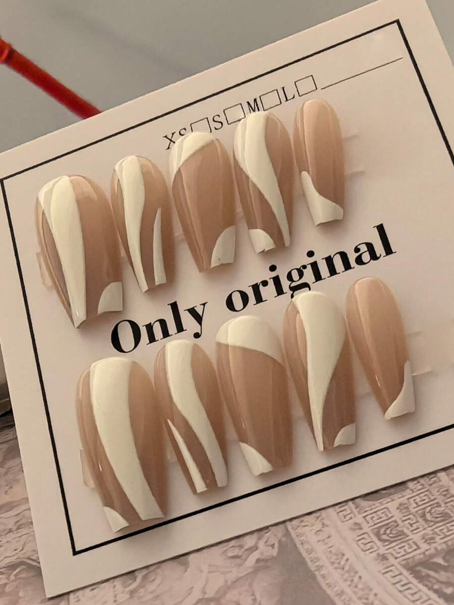 Kawaii 10pcs/Set Extra Long False Nails, High-End Pale Peach Wavy French Style Artificial Nails With Oolong Tea Gradient Effect, Comes With Jelly Glue