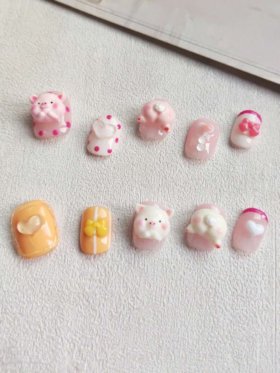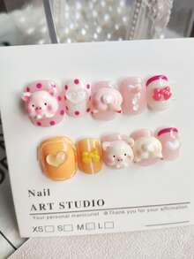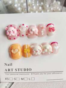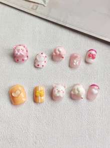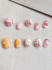 Kawaii 10pcs Short Bread & Pig Design False Nails With Jelly Glue
