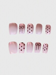 Kawaii 10pcs Short Cat Eye Gradient Pink Polka Dot Bow Knot Design Nail Stickers, Daily Wear For Students And Office Workers, Handmade, Removable, And Reusable False Nails Set, With Free Jelly Glue