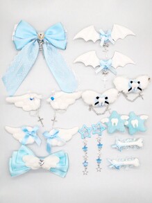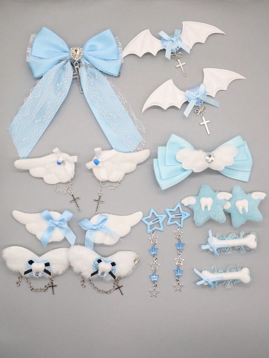 Kawaii 16pcs Random Blue Vintage Lolita Hair Clips, Cute Bow, Wing, Bone, Star Shaped High Quality Hair Accessories, Variety Of JK Style Combination