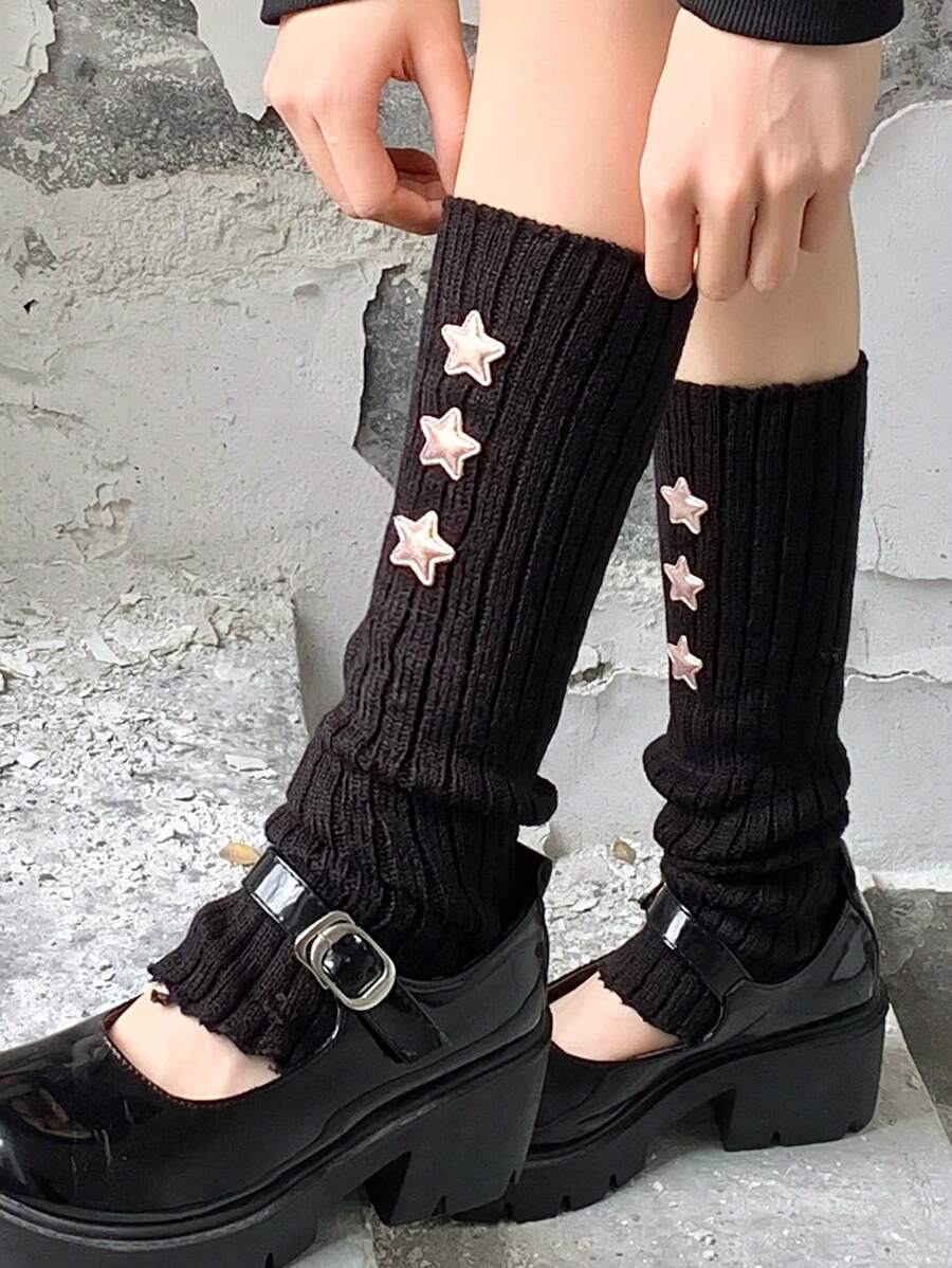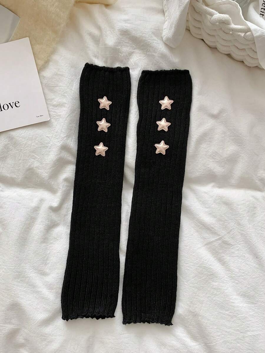 Kawaii 1pair Unisex Black Striped Leg Warmers With Pink Stars Pattern, Ideal For School And Home Winter, Spring, Summer And Autumn