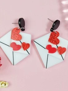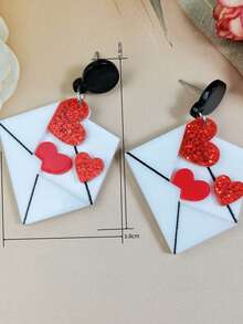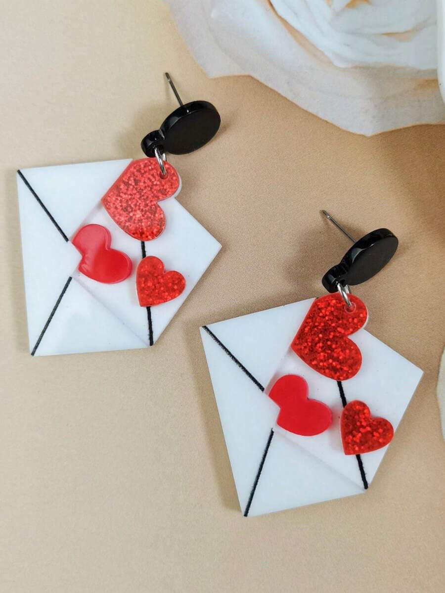 Kawaii 1pair Valentine's Day Sweet & Romantic Glitter Heart Shaped Envelope Design Acrylic Earrings For Women