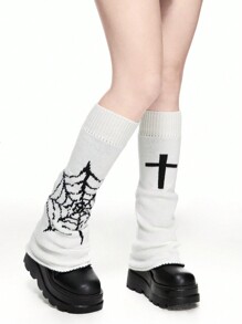 Kawaii 1pair Women's Reversible Halloween Spider & Cross Pattern Leg Warmers, Black & White, All Seasons