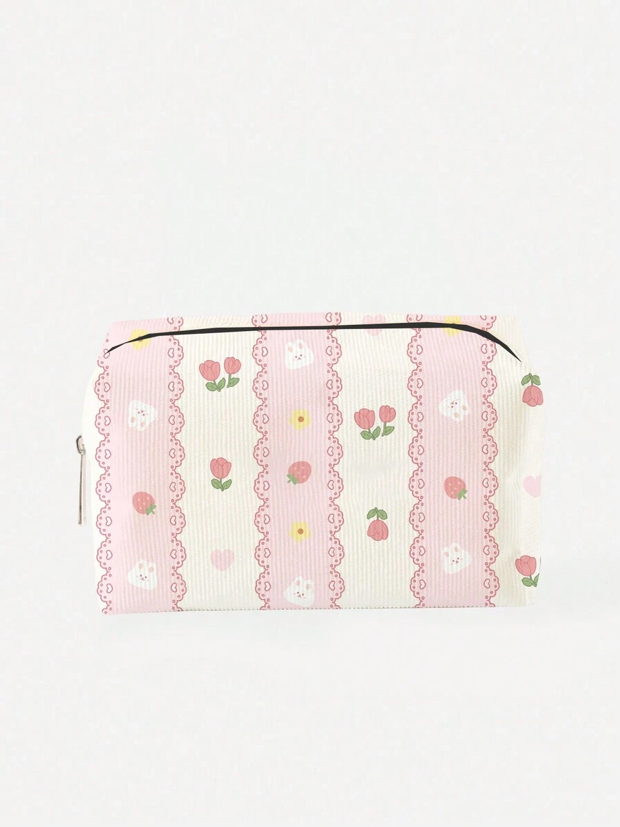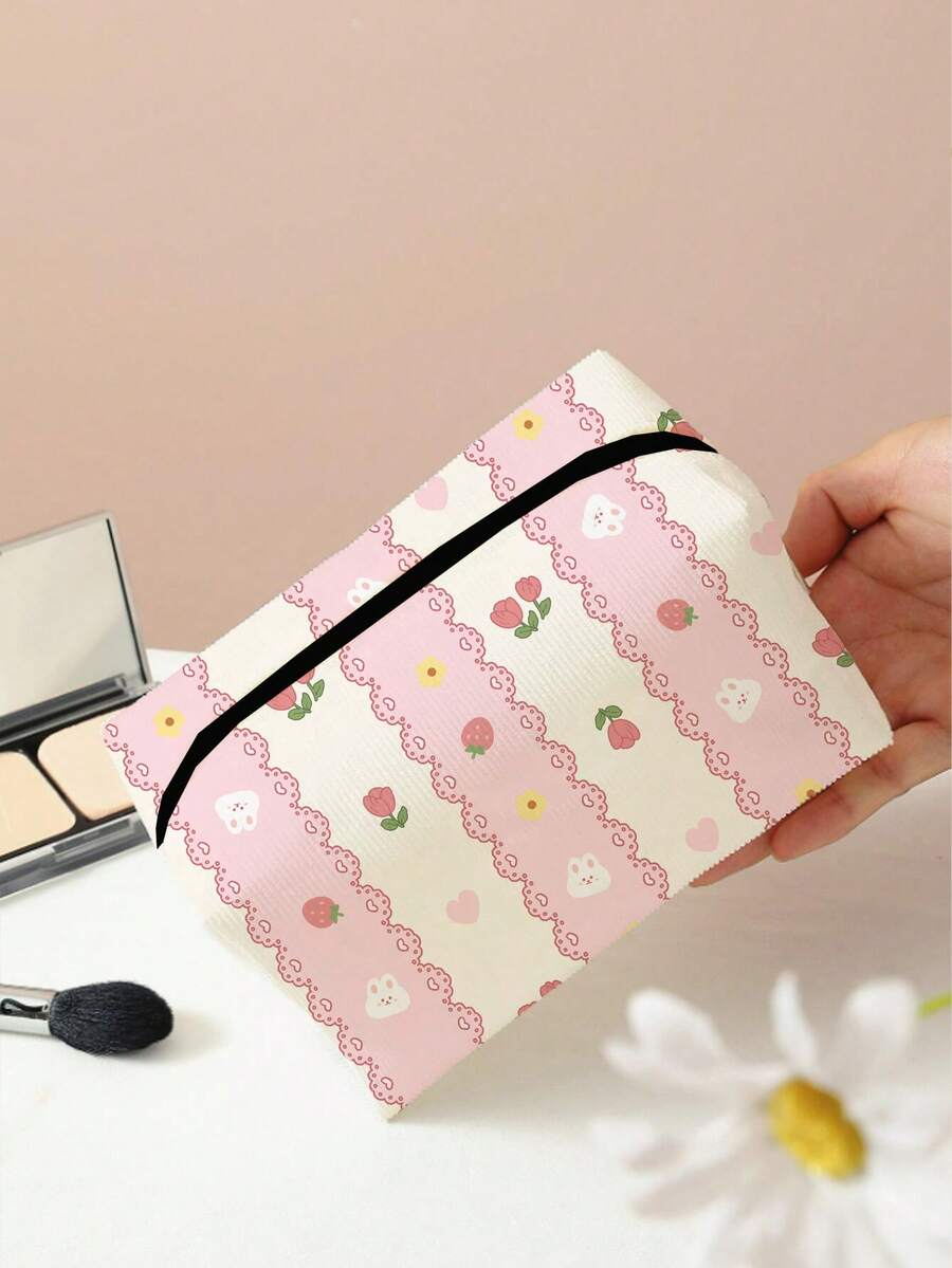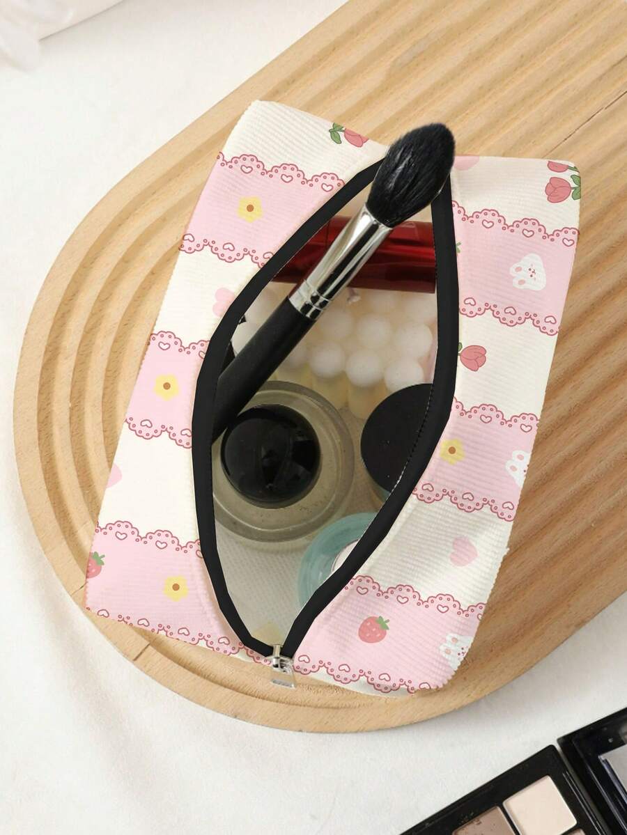 Kawaii 1pc Cosmetic Bag With Floral & Strawberry Pattern, Makeup Pouch For Travel