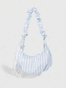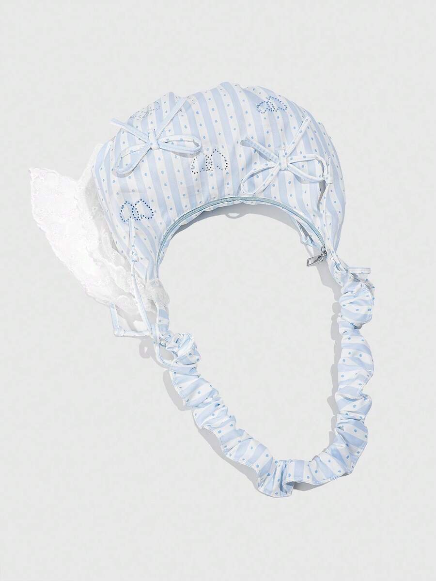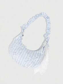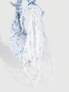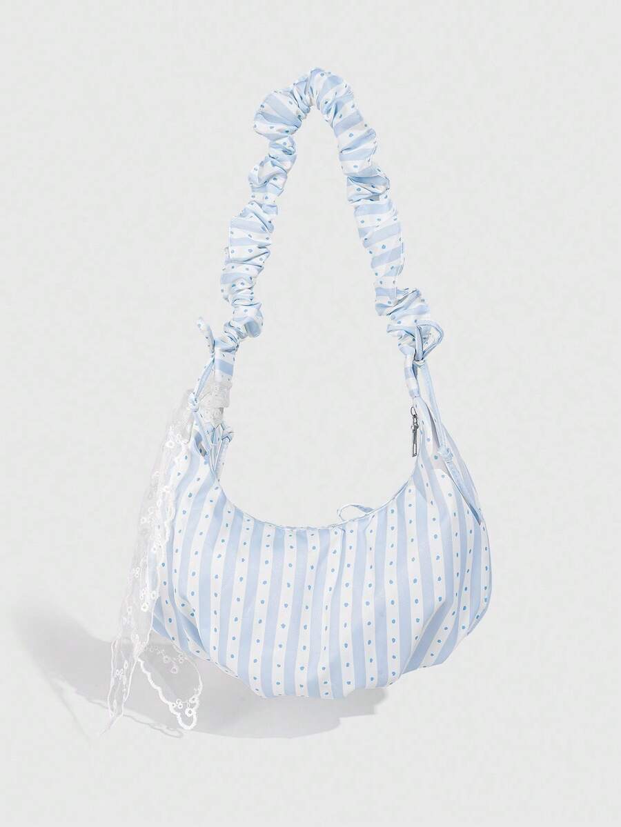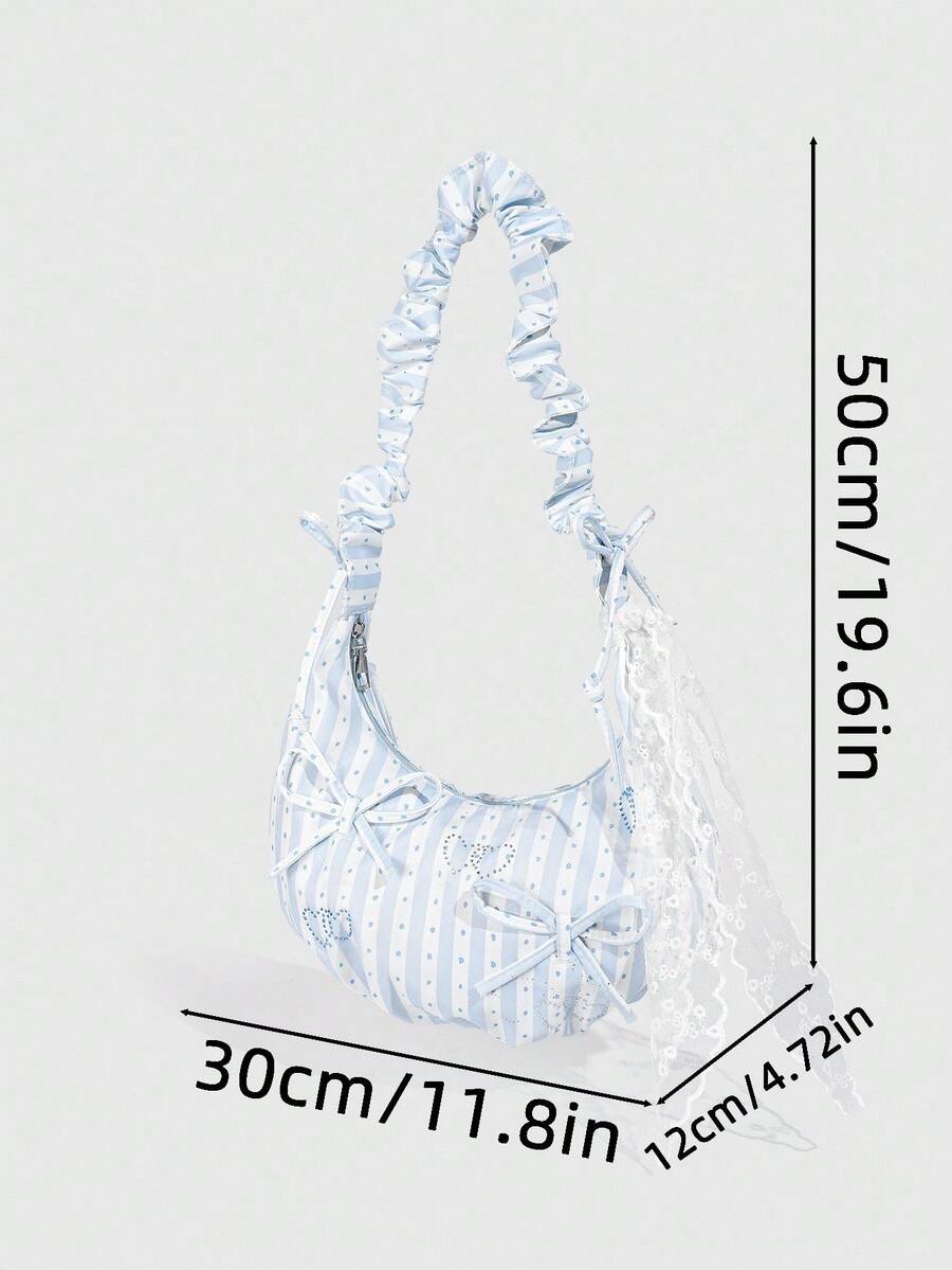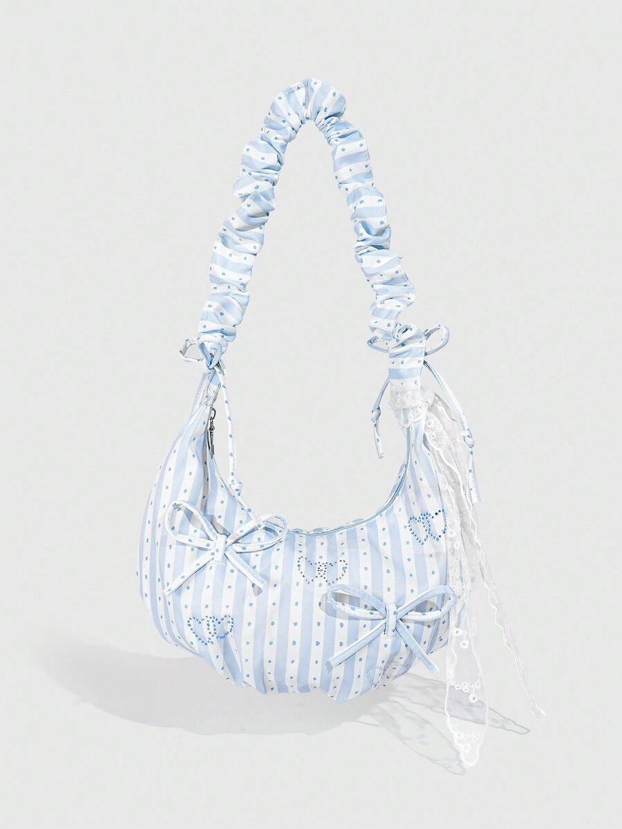 Kawaii 1pc Cute Japanese Style Blue & White Striped Heart & Crescent Moon Crossbody Bag, Ruffle Trim Drawstring Shoulder Bag With Bow & Heart Decor, Suitable For Teens And Students For Daily Use