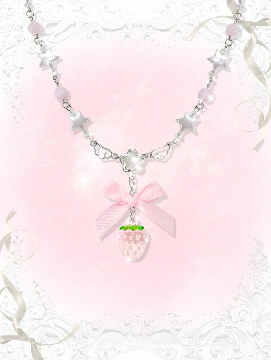 Kawaii 1pc Cute Pink Strawberry Bow Pendant Necklace, Perfect For Daily Wear Valentines
