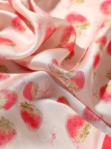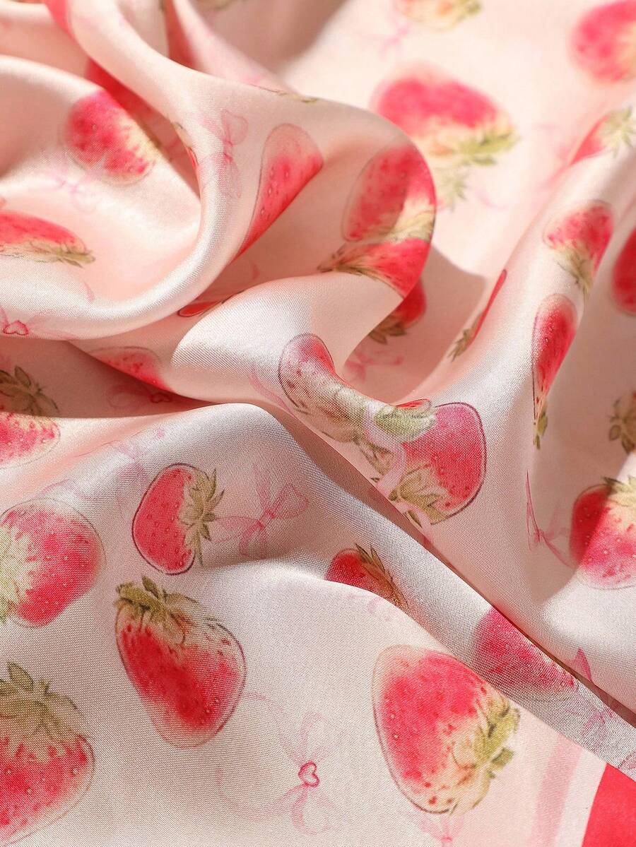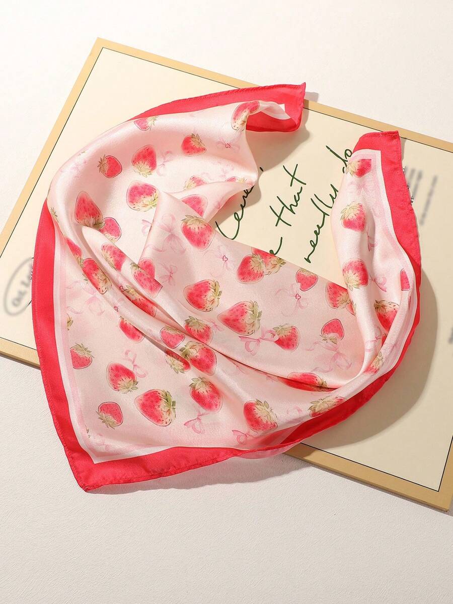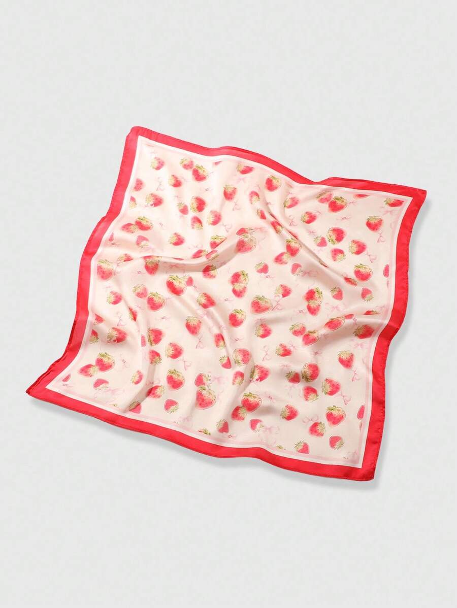 Kawaii 1pc Cute Strawberry & Bowknot Print Girl Square Scarf, Versatile Casual Countryside Style Accessory Suitable For Daily Life, Vacation And Decoration
