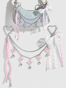 Kawaii 1pc Fashionable & Minimalist Silver Hollow Chain, CCB Resin Heart Wings Round Pearl Net Tulle Bow Braided Rope DIY Keychain Bag Charm Accessory, Elegant Gift For Women