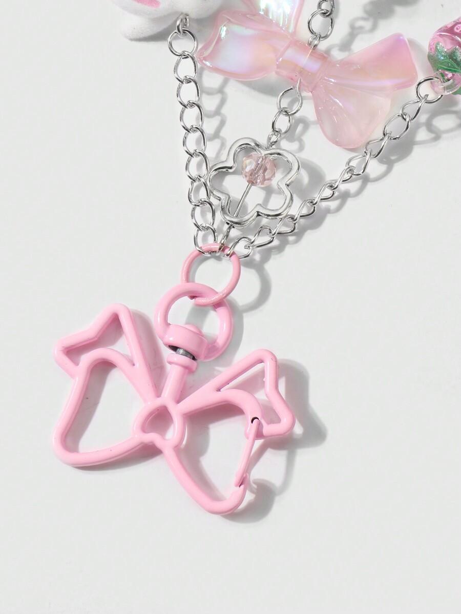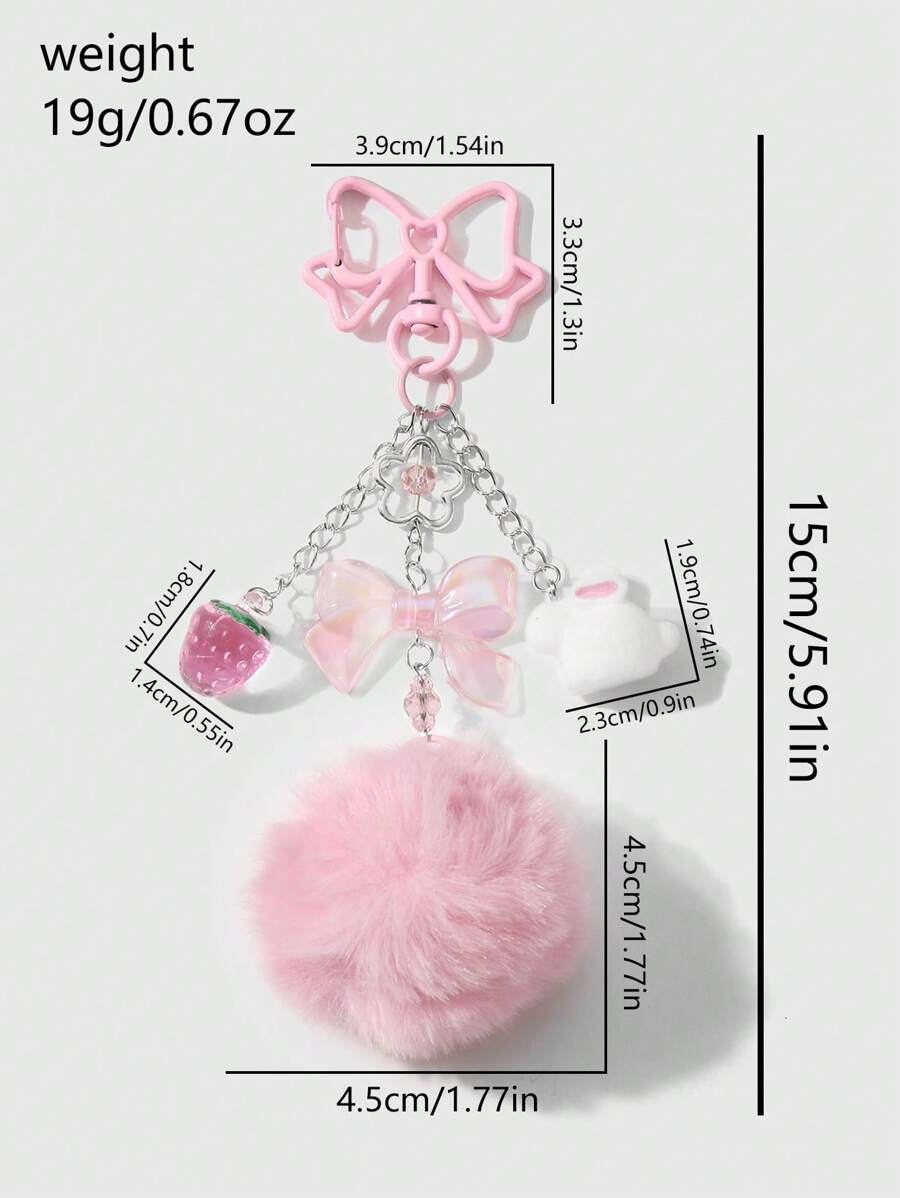 Kawaii 1pc INS Korean Style Cute Sweet Girl Fashionable High-Quality Silver Chain Pink Furball Resin Bow Strawberry Flocked Small Rabbit Pendant & Keychain, Suitable For Women, Daily Use Or Festival Gift Valentines
