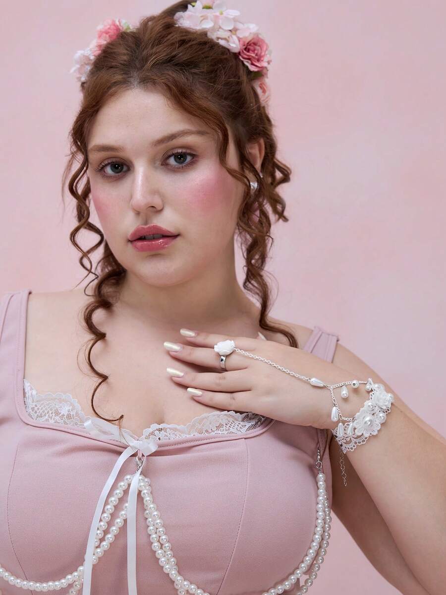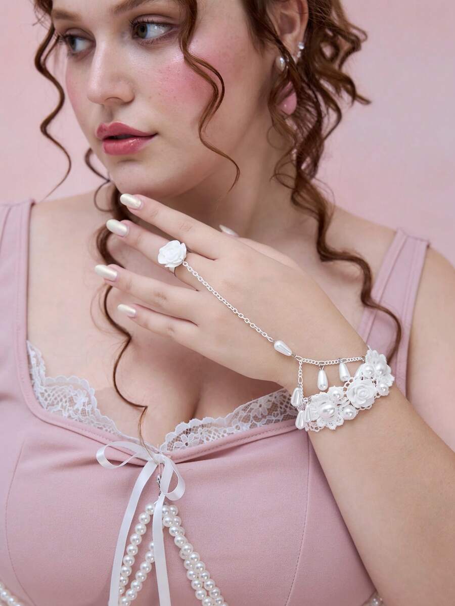 Kawaii 1pc Lovely Rococo Design Rose & Pearl Pendant Bracelet, High-Quality Flower Pattern Lace Bracelet Ring Set, Handmade Adjustable Braided Strap