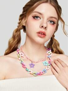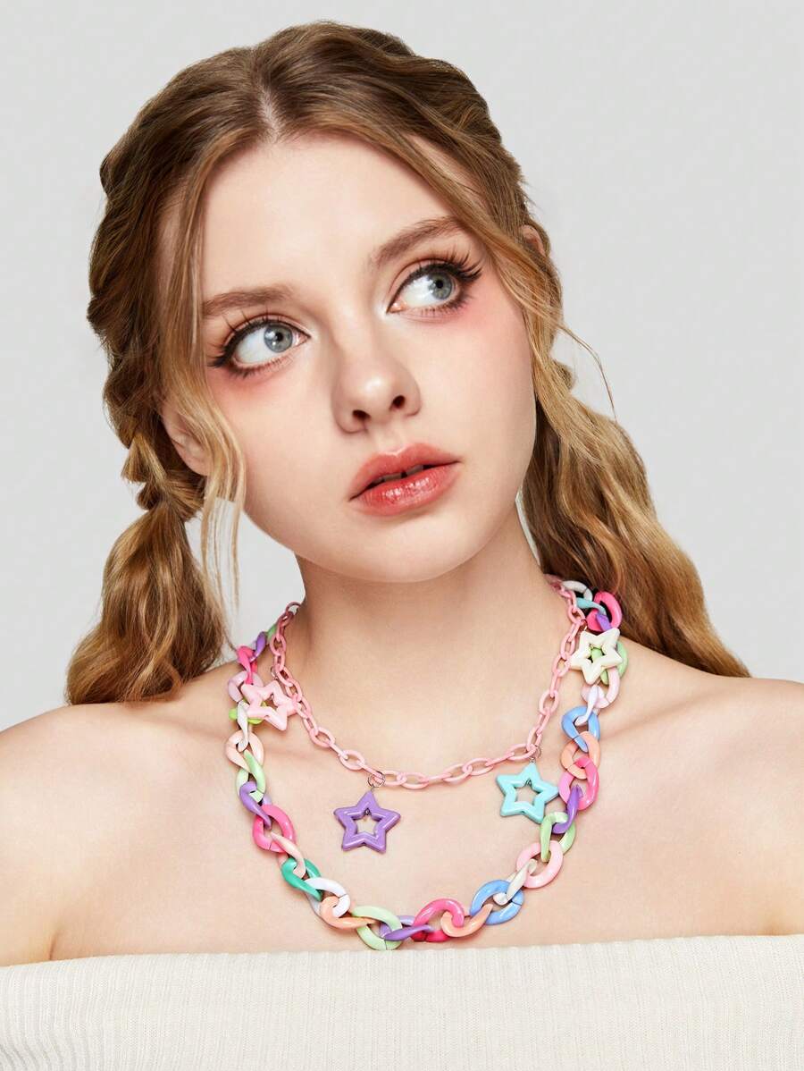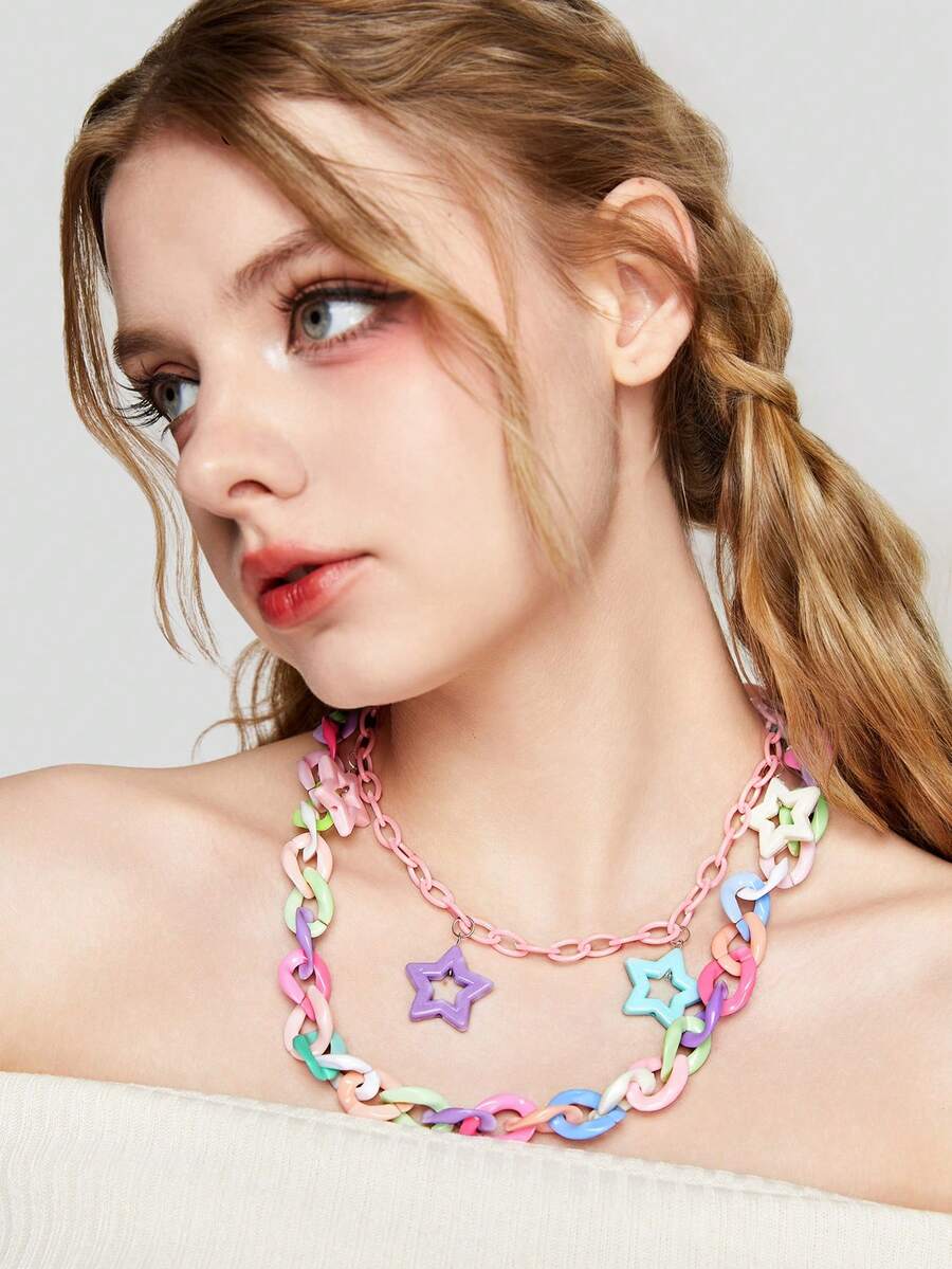 Kawaii 1pc Personalized Acrylic Double Layered Choker Necklace With Random Color Star Pendants In Millennial Style