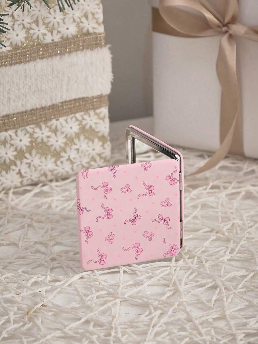 Kawaii 1pc Pink Bow Polka Dot Print Square Mirror, Portable Handheld Mirror For Girls, Makeup Touch Up (Pattern Placement Random)