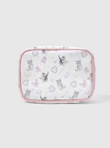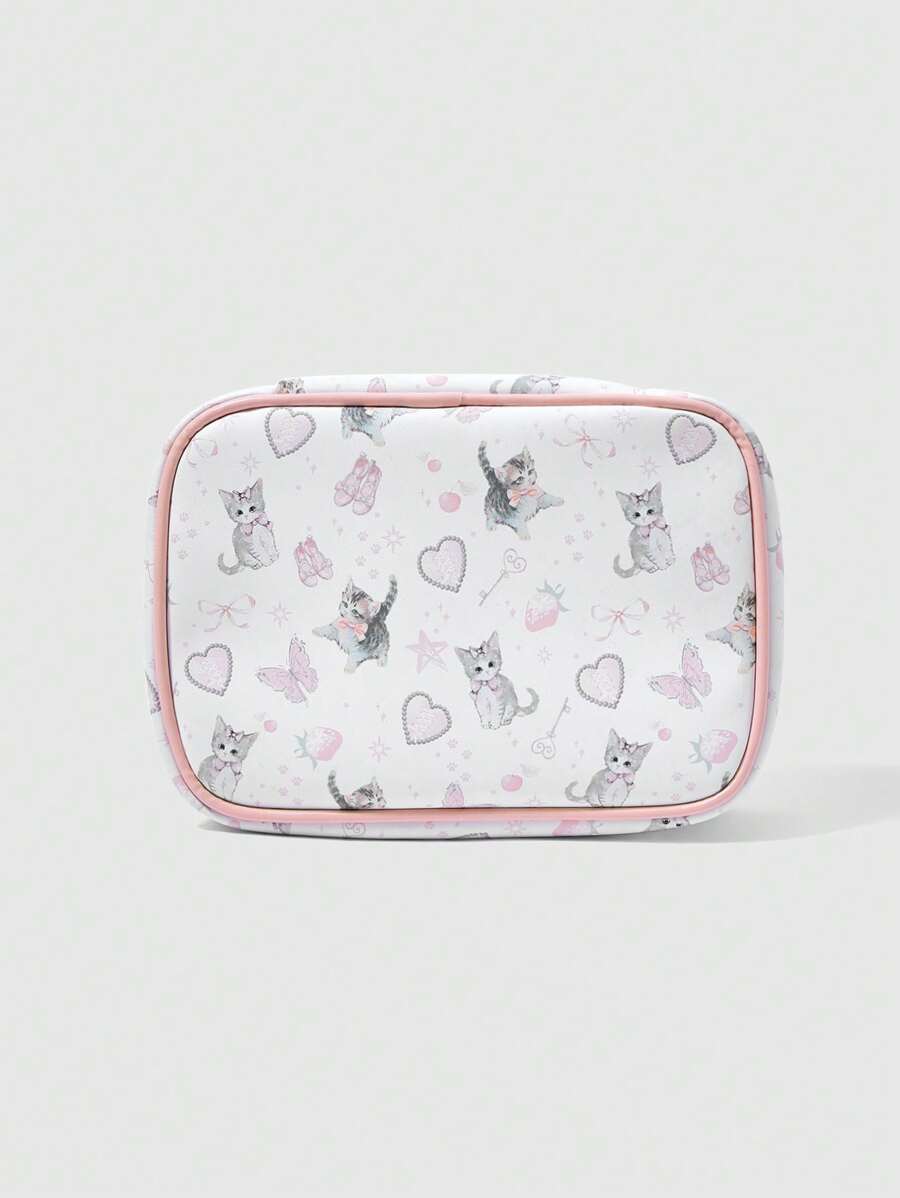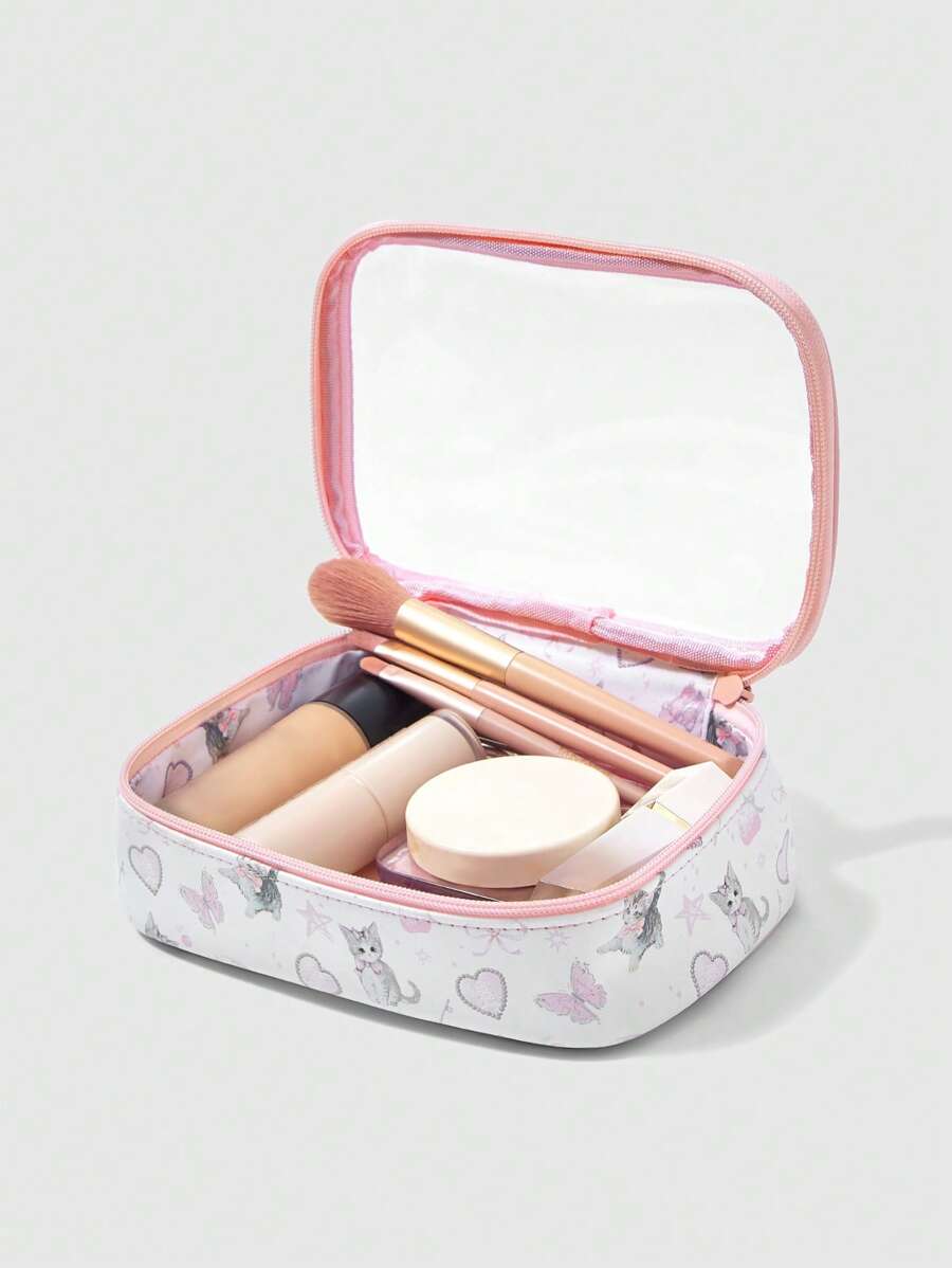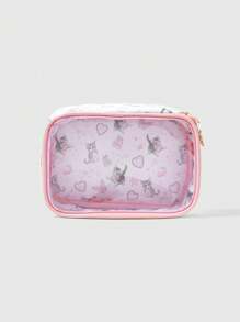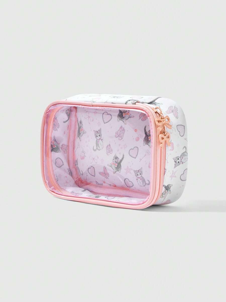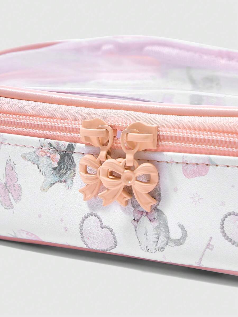 Kawaii 1pc Pink Cute Bow Printed Transparent Patchwork Storage Bag, Square Portable Toiletry Organizer