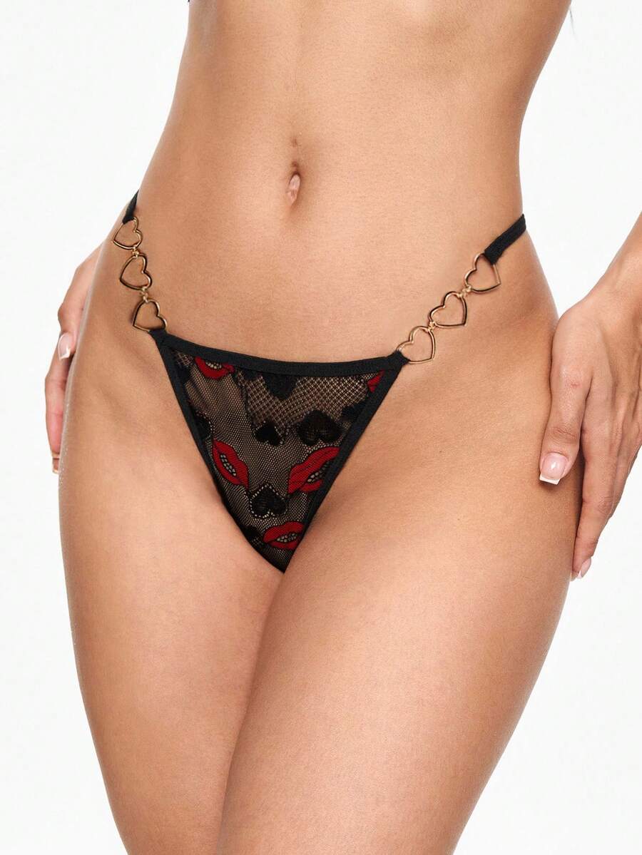 Kawaii 1pc Sexy Lace & Metal Heart Decor Sheer Panty For Women