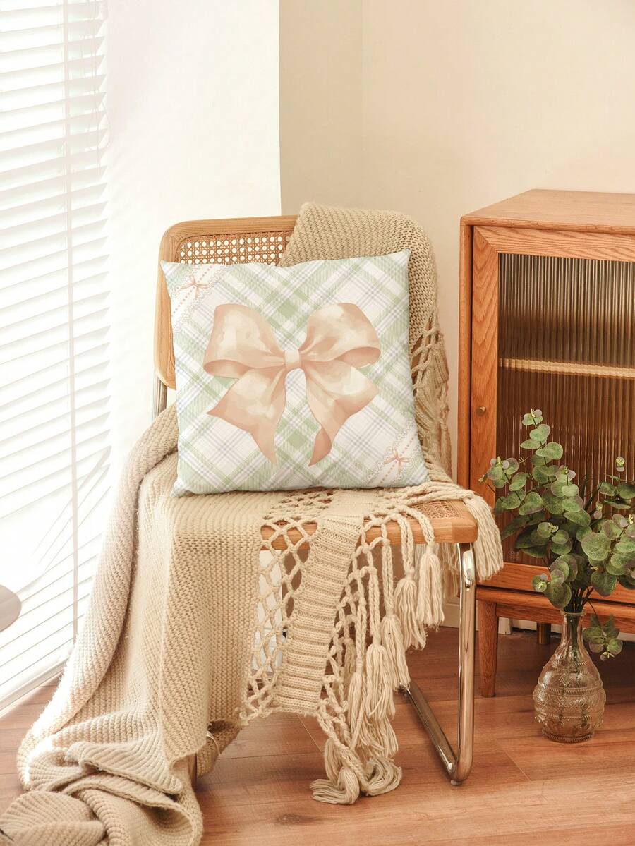 Kawaii 1pc Simple Hand-Drawn Romantic Light Green Bow Knot & Plaid Pattern Pillow Case (Without Pillow), Velvet Printed Square Cushion Cover, Suitable For Daily Home Decor In Living Rooms And Bedrooms; Can Be Used As Sofa Cushion Cover, Car Cushion Cover; All-Season Pillow Case