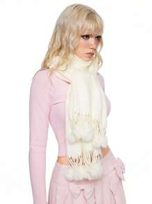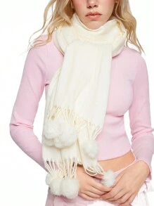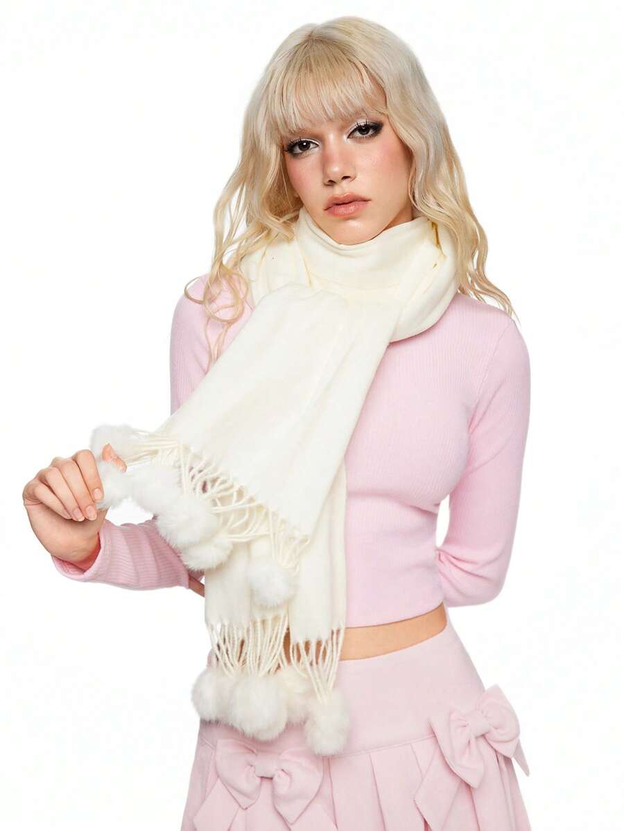 Kawaii 1pc Solid Color Tassel Pompom Scarf, Long Winter Warm Fuzzy Pompom Scarf