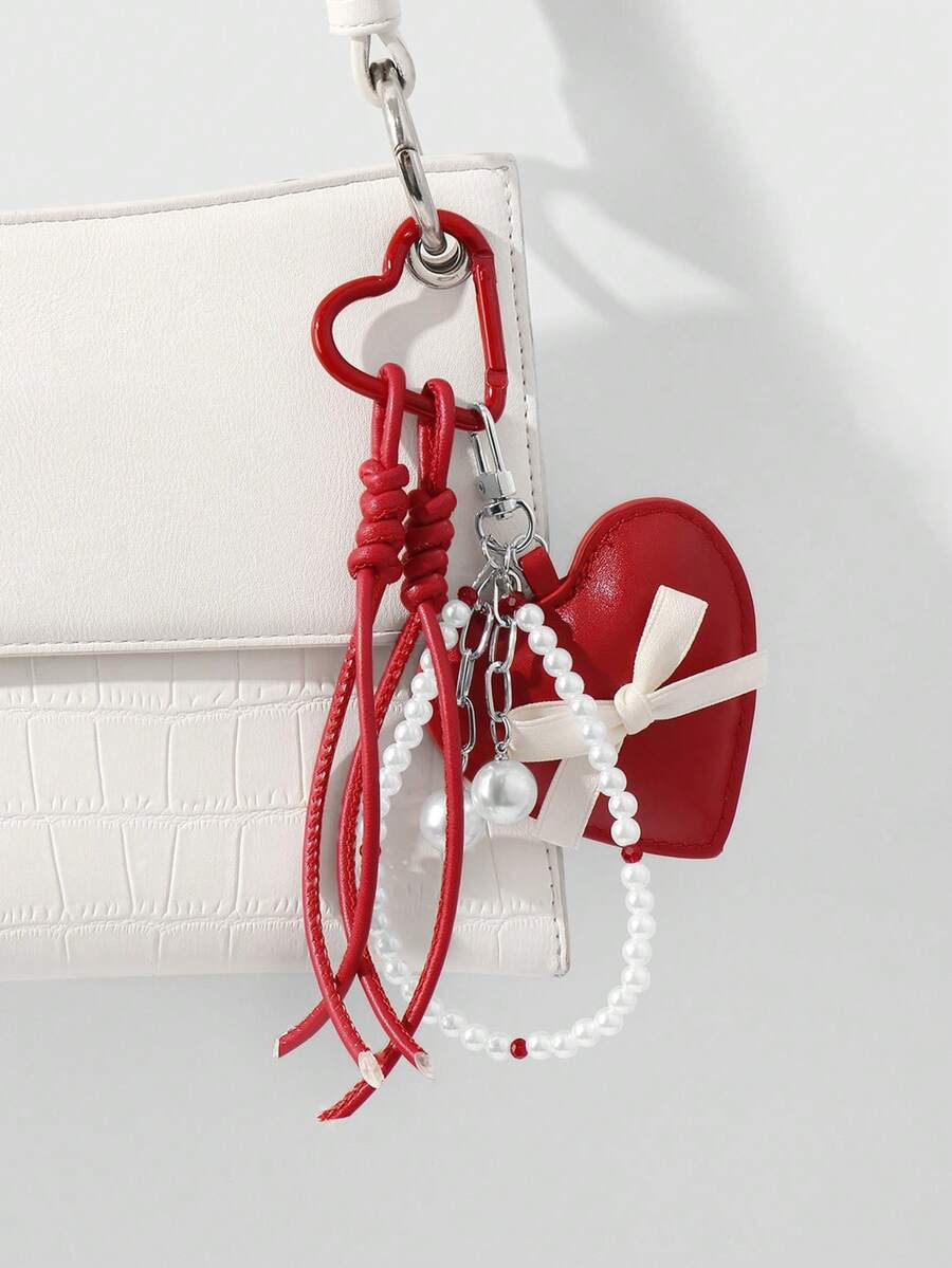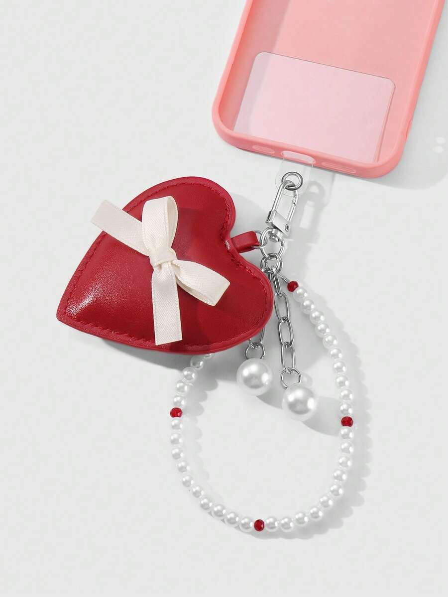 Kawaii 1pc Style Elegant Sweet Versatile High-End Handmade Beaded White Faux Pearl, Red Imitation Crystal, Leather, Bow Decor Lanyards, Keychain, Bag Charm, Phone Charm, Suitable For Women, Daily Wear, Holiday Gift