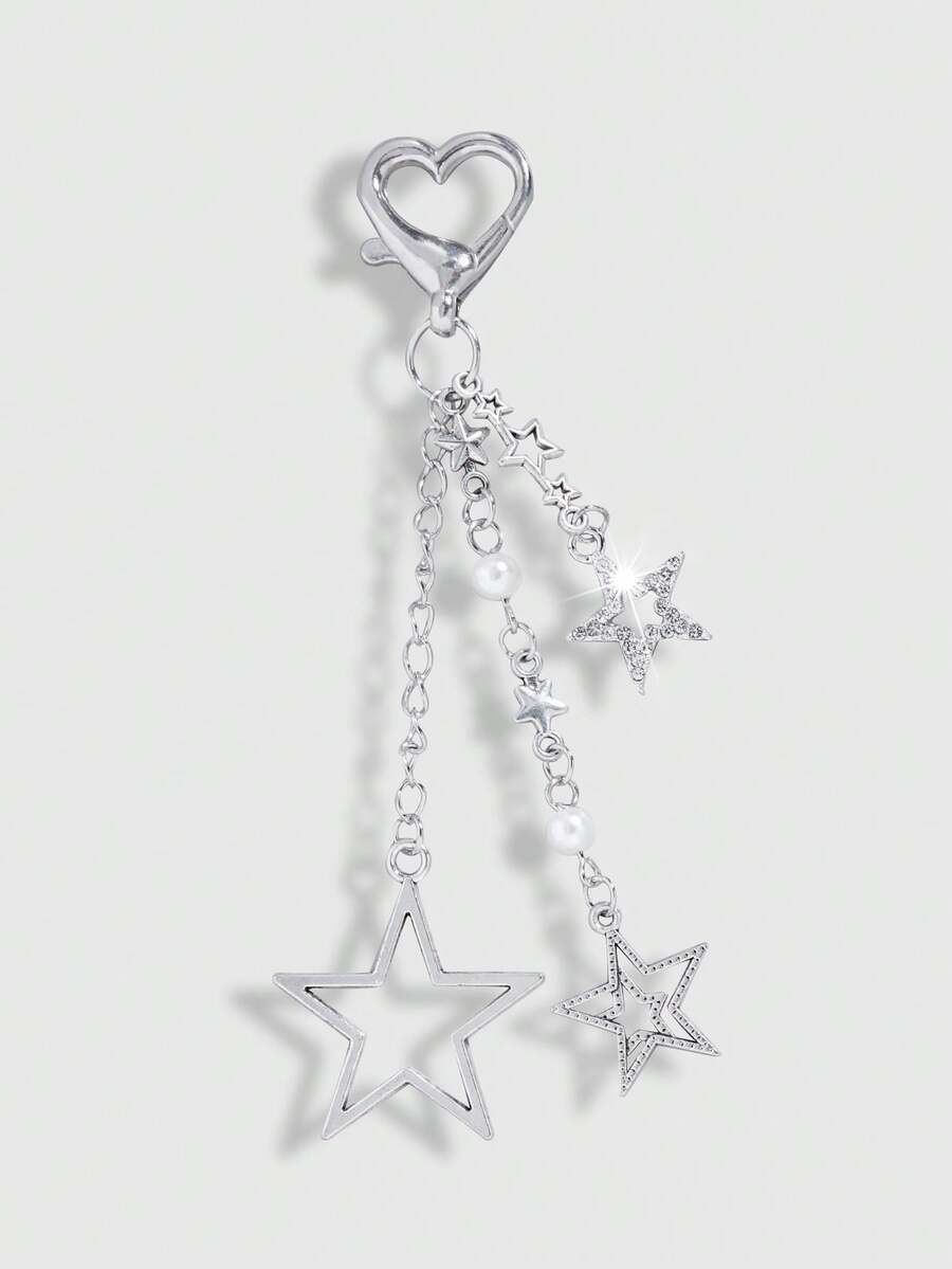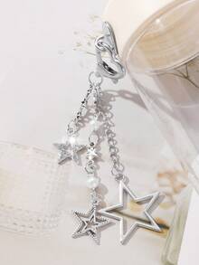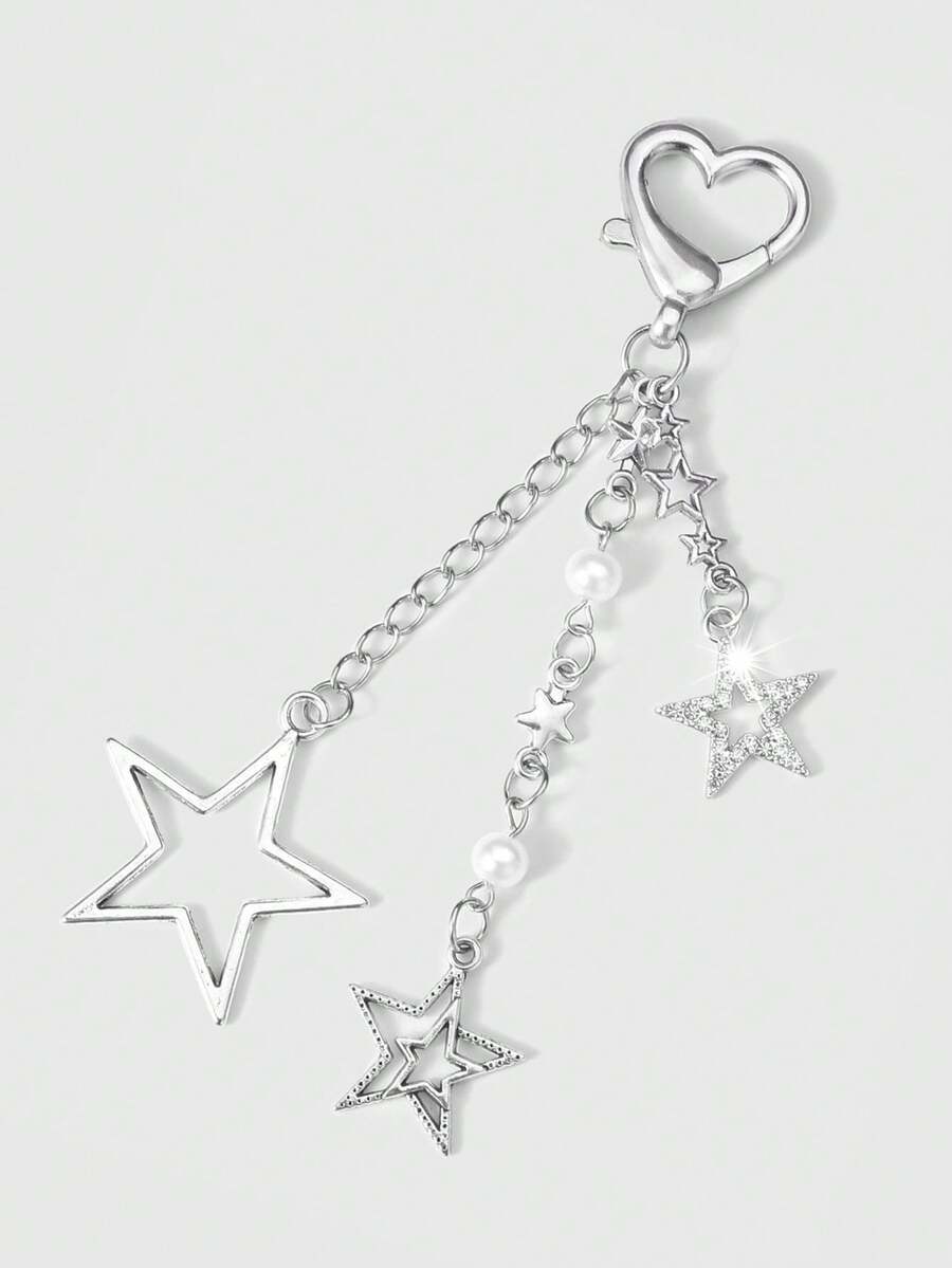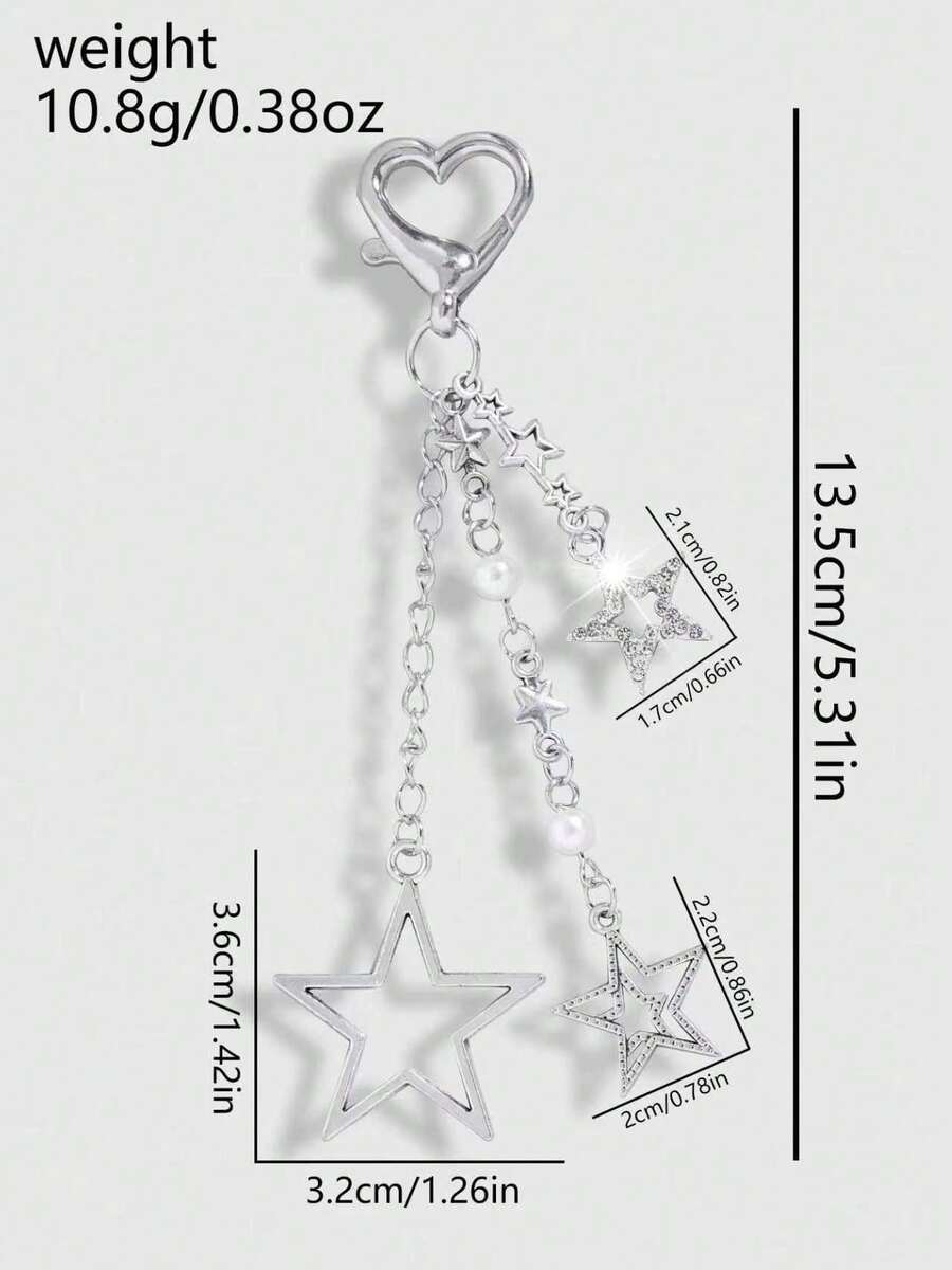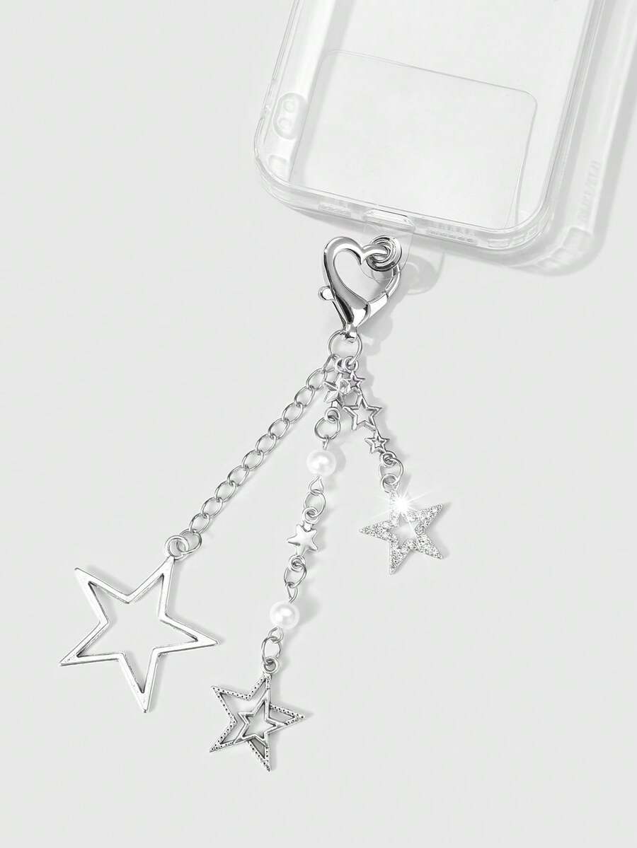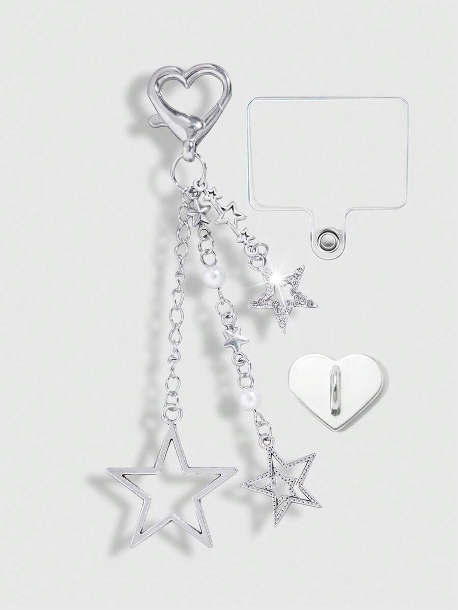Kawaii 1pc Y2K Fashion Delicate Casual Versatile High-Quality Silver Chain White Faux Pearl Rhinestone Hollow Star Decor DIY Heart Keychain Bag Charm Phone Pendant Cup Accessory, Comes With Phone Holder Sticker & Heart Decor, Suitable For Women, Great Gift