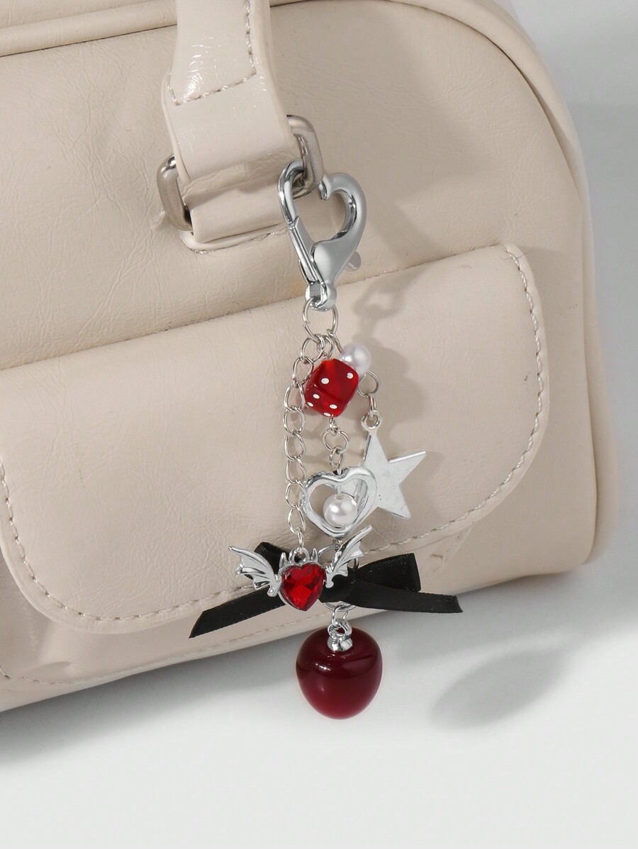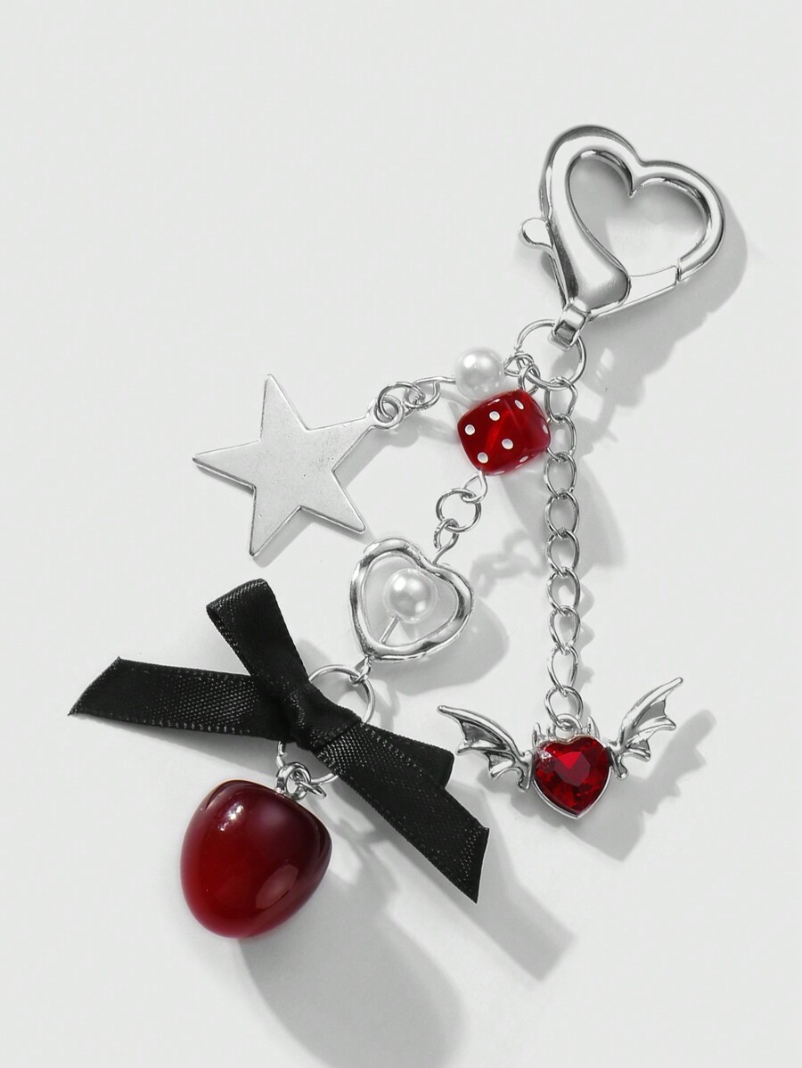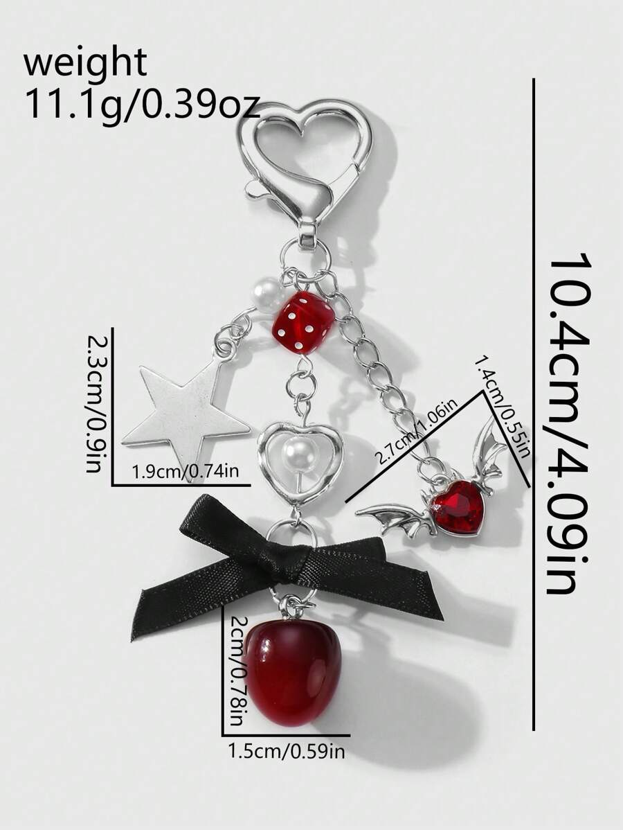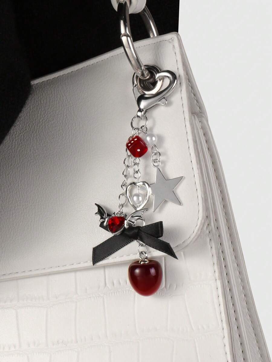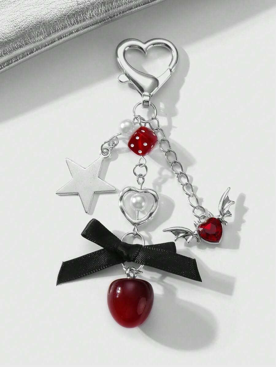 Kawaii 1pc Y2K Fashion Unique Soft Grunge Gothic Silver Chain Faux Pearl Star Rhinestone Wing Heart Ribbon Bow Faux Cherry Pendant Keychain Bag Charm, Suitable For Women/Girls Everyday Wear & Holiday Gift, Halloween