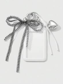 Kawaii 1pc Y2K Minimalist Versatile High-Quality Handmade Beaded Silver CCB Plaid Ribbon Bow Heart Woven Acrylic Card Holder Keychain Bag Charm, Suitable For Office Workers, Students, Daily Wear, Holiday Gift