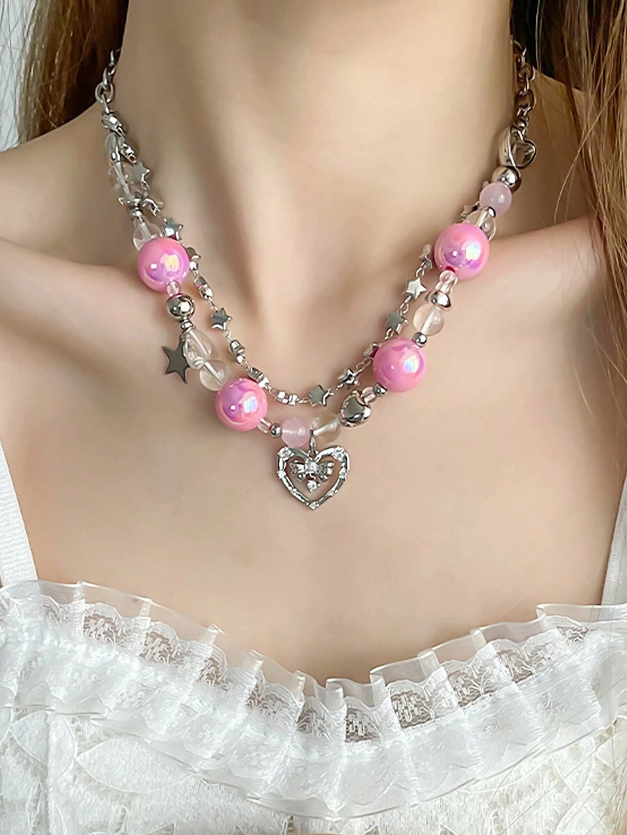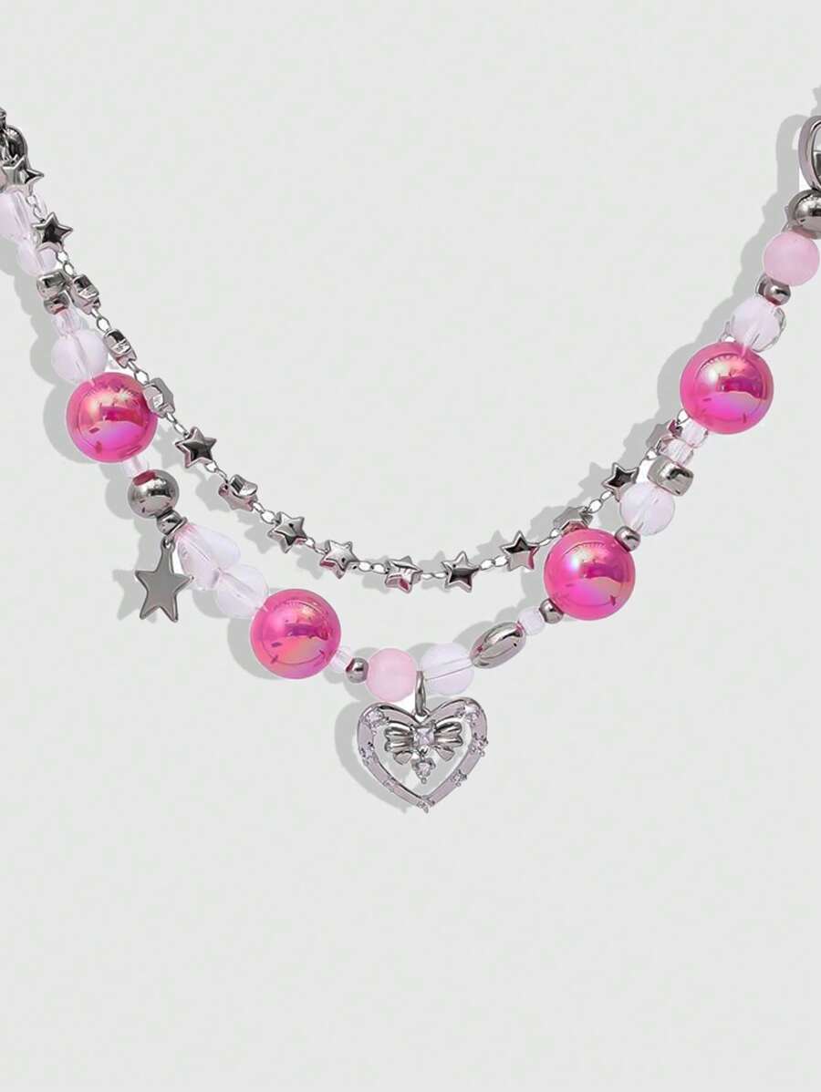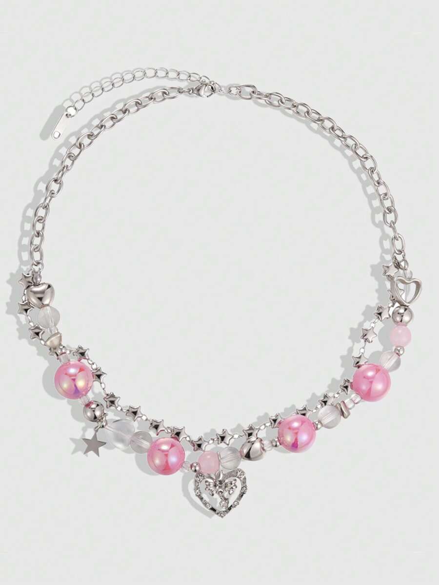 Kawaii 1pc Y2k Pink Beaded Necklace With Star & Heart Pendant