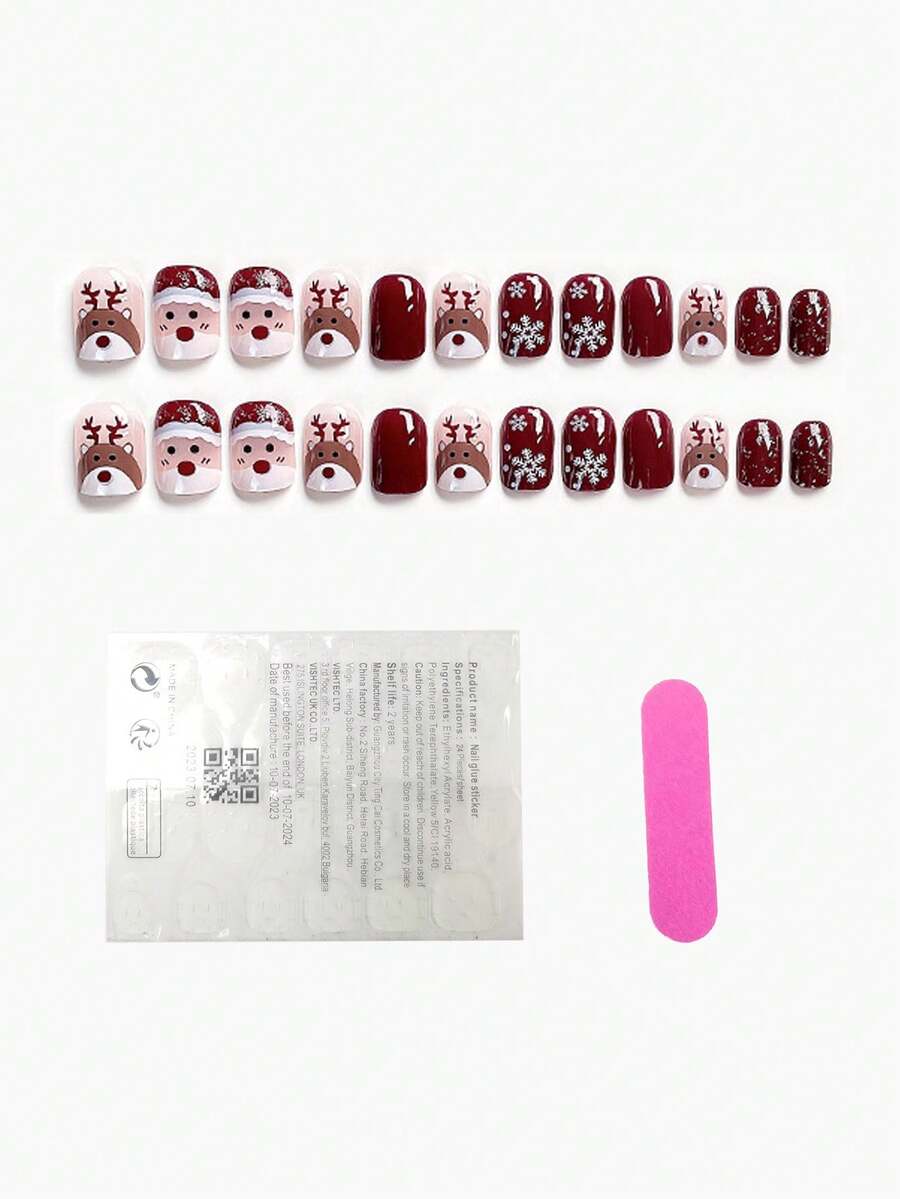 Kawaii 24pcs Short Square Christmas Pattern False Nail Tips With Reindeer, Santa Claus And Snowflake Designs